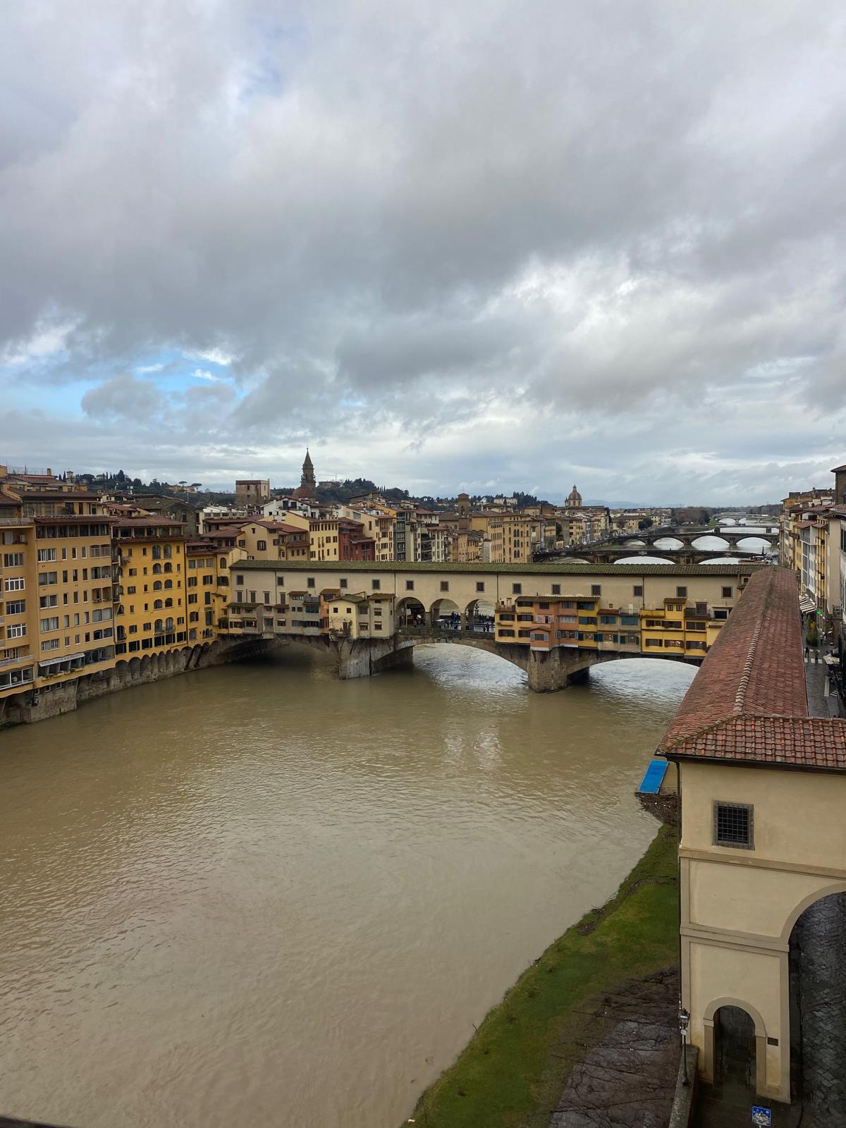 El Puente Vecchio es escenario inmortal de la historia de amor platónico entre Dante Alighieri y Beatriz Portinari. También es considerado el puente de piedra más antiguo de Europa (1345). Es también punto icónico para turistas y milla de oro de la joyería. A lo largo del puente se ubican numerosos establecimientos que muestran en sus escaparates cuidados diseños de oro y plata, aunque la verdadera joya para el viajero-turista está en el fondo de la tienda, desde donde se aprecia el Arno y otros puentes de la ciudad.