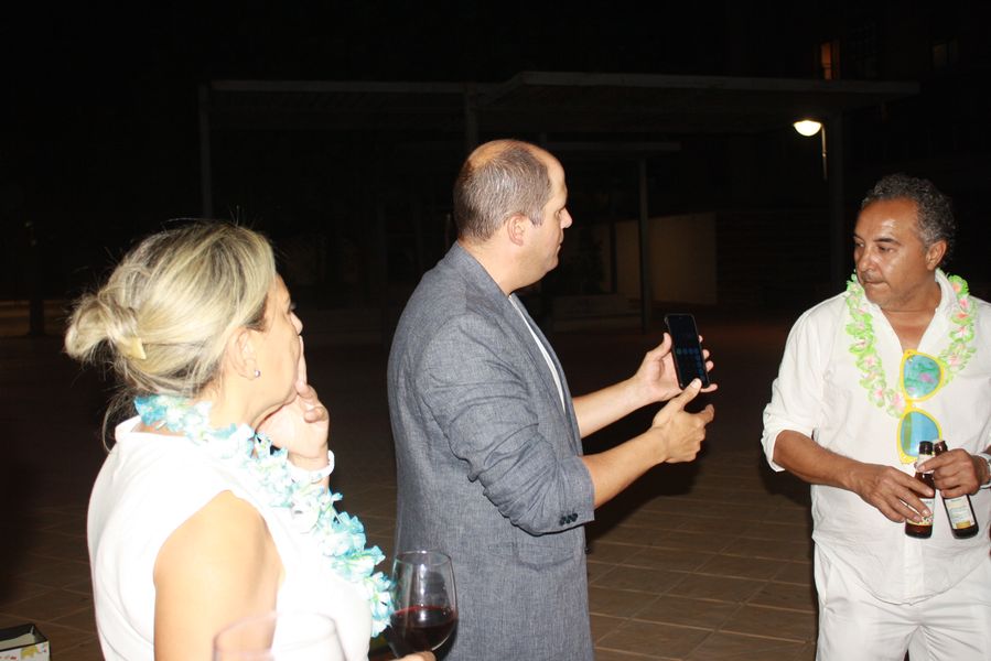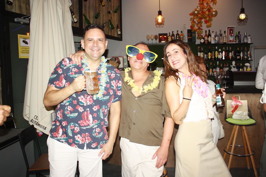 Los invitados, ataviados con collares hawaianos y gafas gigantes o narices de payaso, posaron para fotos llenas de alegría, en una escena que parecía salida de una fiesta de verano sin fin.
