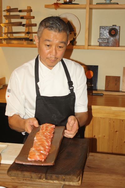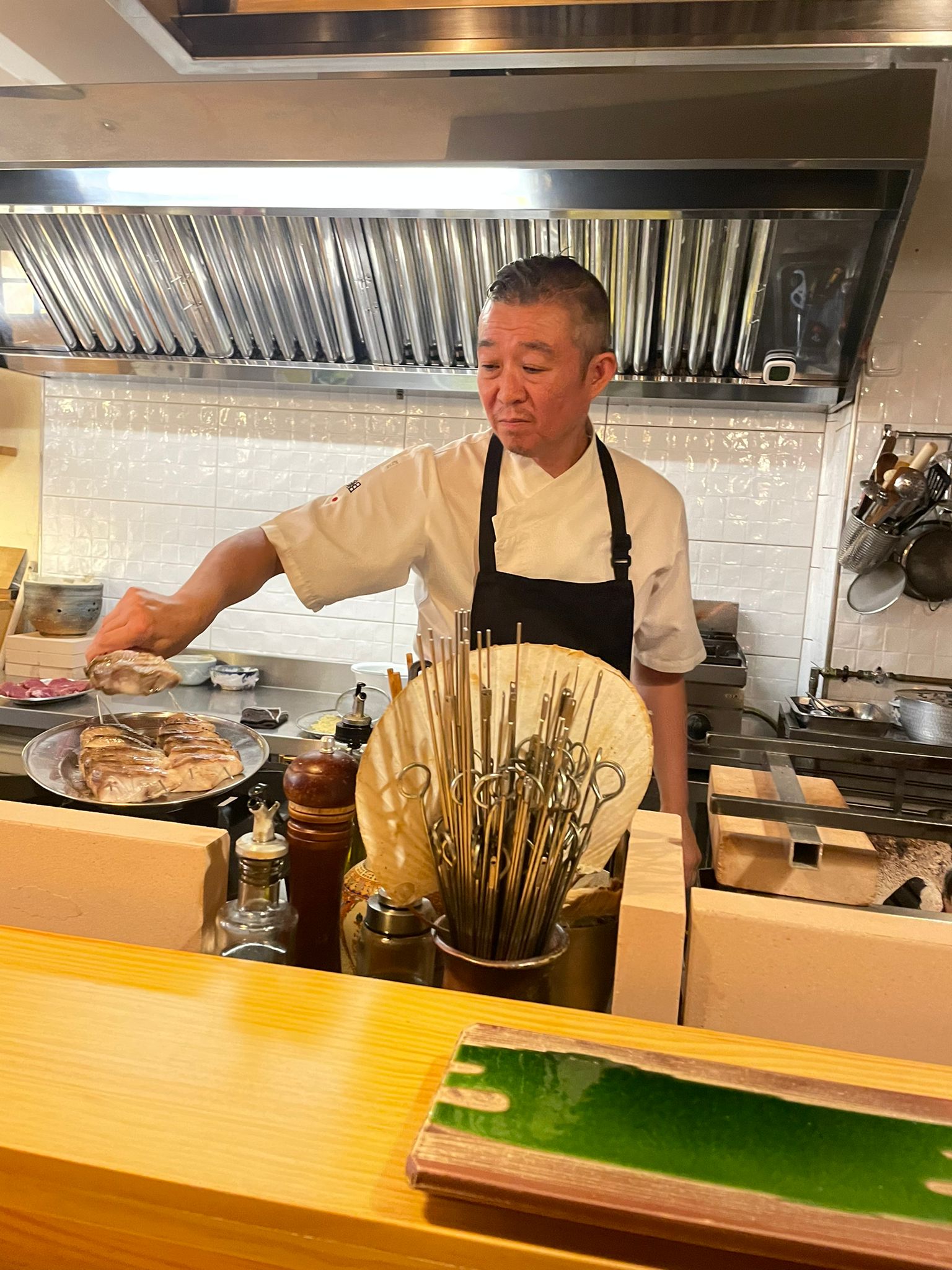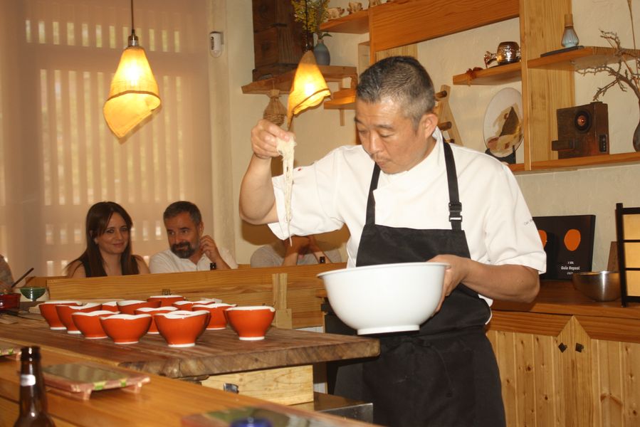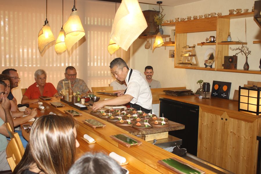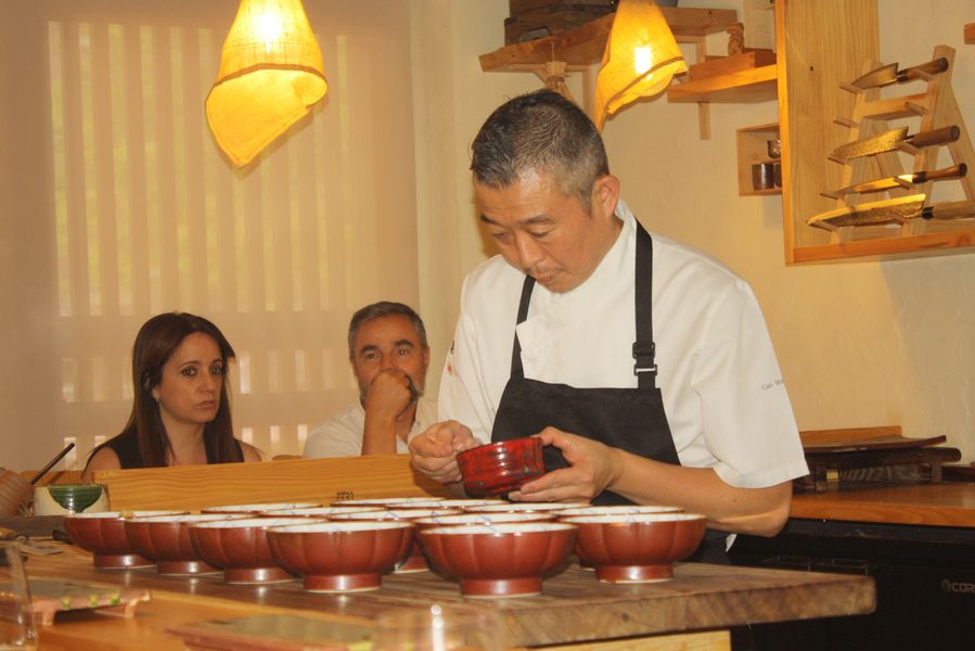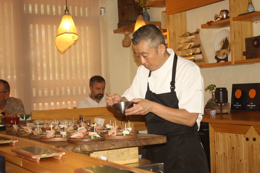 Formado desde joven en Japón y luego en Tokio, decidió dar el salto a Europa en 2007. Tras varios años trabajando en Barcelona, llegó a Murcia en 2019, y desde entonces, con apenas tres personas en su equipo (entre ellas Silvia y Samira), mantiene una dinámica meticulosa: todos los platos se elaboran en caliente o frío y al momento, justo cuando todos los comensales están sentados.
