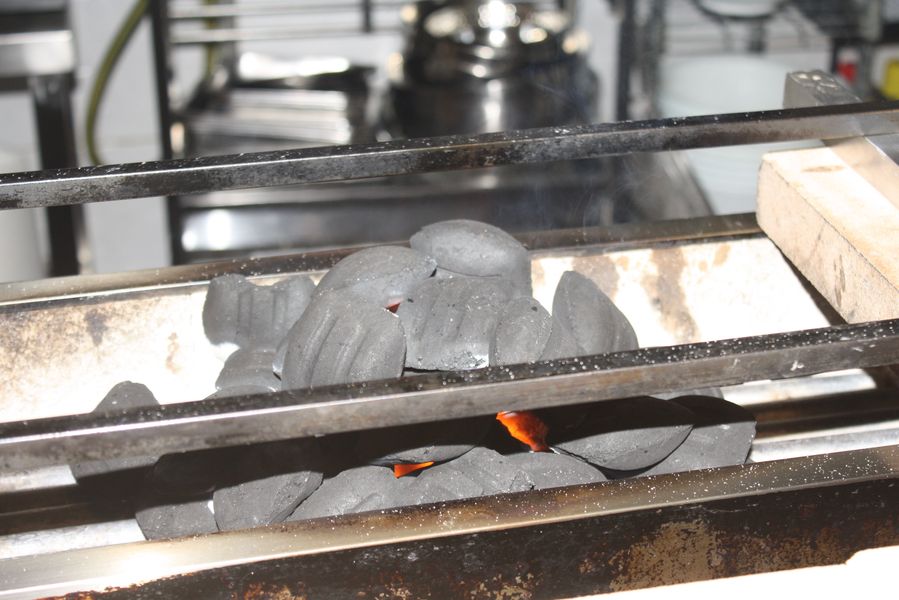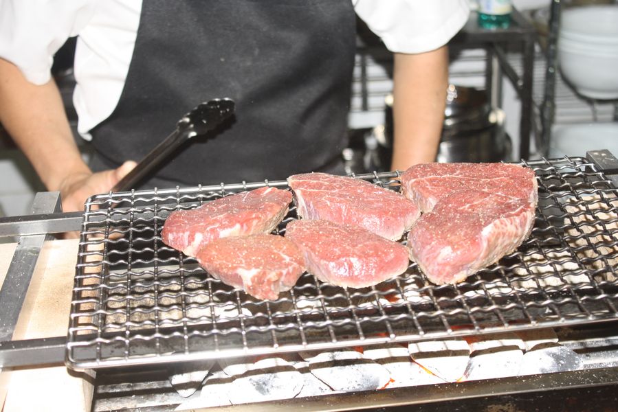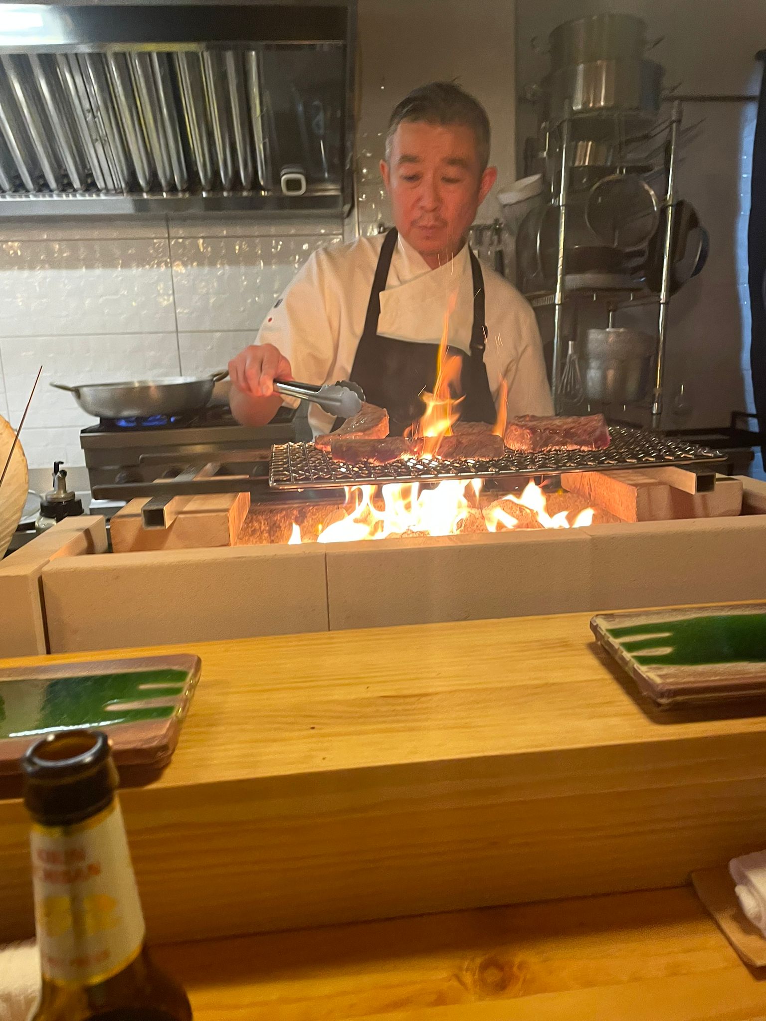 El restaurante, ubicado en un espacio minimalista, destaca por su cocina a la vista. En el centro, una gran mesa en forma de «L» permite seguir cada movimiento del chef. A la izquierda, Makoto maneja cuchillos, woks y vaporeras y prepara con precisión y destreza sus niguiris apretando el arroz con sus manos; a la derecha, las brasas, a veces demasiado cercana en días de calor extremo. Pero eso también forma parte del encanto: estar tan cerca del arte que se cocina.