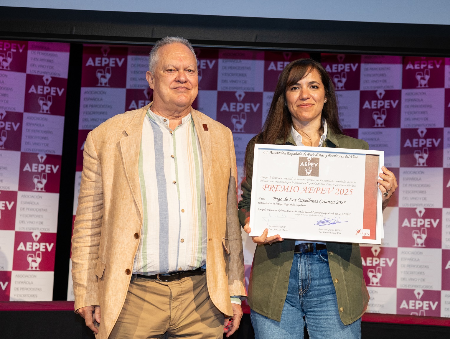 Antonio Caravaca, por parte de Gil Family States, recibió el galardón por el vino La Atalaya del Camino 2023, (D.O.Almansa) (Albacete) en la categoría de vinos tintos de 2023, 2024 y 2025. Preguntado por el significado de este premio para su bodega, destacó la importancia de este reconocimiento por venir de periodistas especializados. Y en cuanto al vino La Atalaya del Camino, Caravaca describió la singularidad de la variedad Garnacha Tintorera, autóctona de la denominación de origen Almansa, y cómo el grupo Gil Family Estates trabaja con viñedos viejos para producir vinos concentrados y amables. En esta misma categoría también resultaron premiados El Primero de Fariña (2025), Bodegas Fariña (D.O. Toro) y Pago de los Capellanes Crianza (2023) (Ribera del Duero).