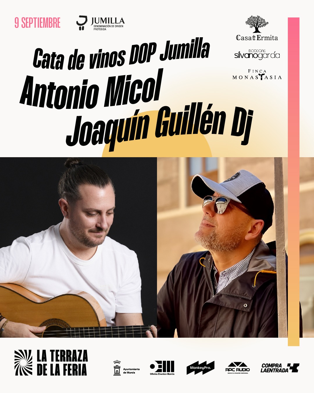 El lunes día 9, será el turno de Bodegas Casa de la Ermita, Bodegas Silvano García y Finca Monastasia, que ofrecerán tres vinos diferentes junto a un maridaje. La noche concluirá con una actuación musical de Antonio Micol y Joaquín Guillén Dj.