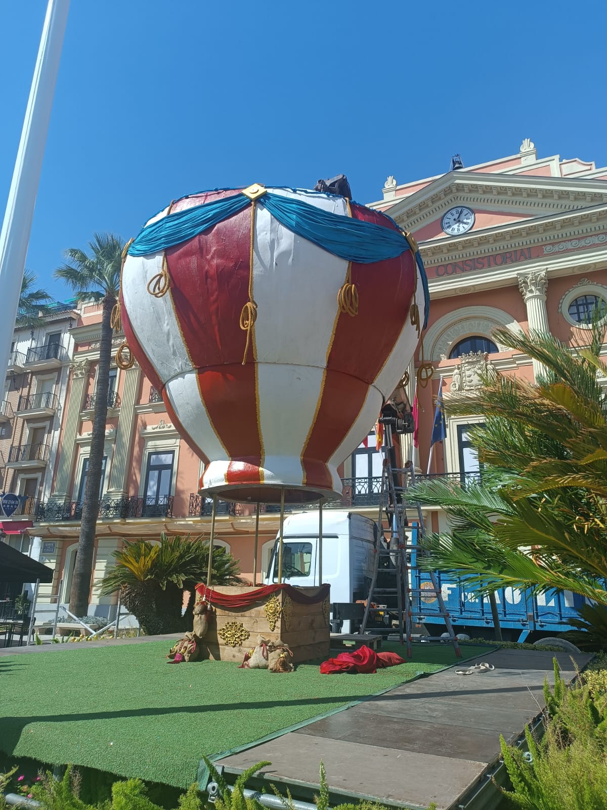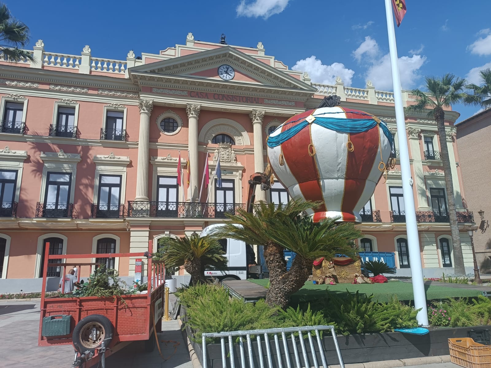 Un globo de siete metros de altura, realizado por la empresa murciana Matíss Creaacción, se instala en Glorieta de España para embellecer la plaza durante estas fiestas de septiembre.