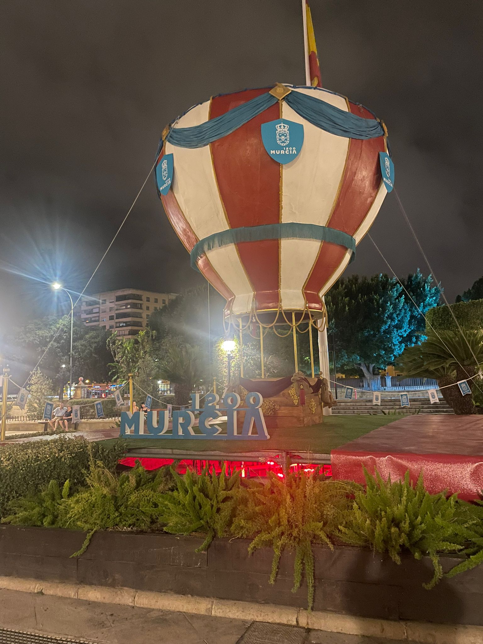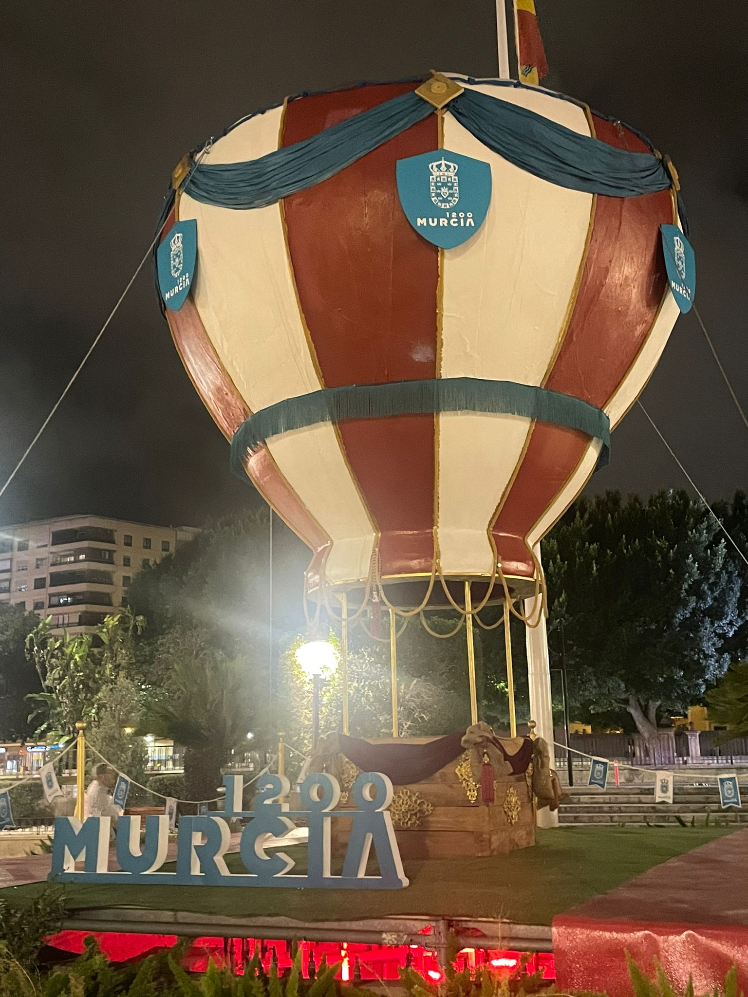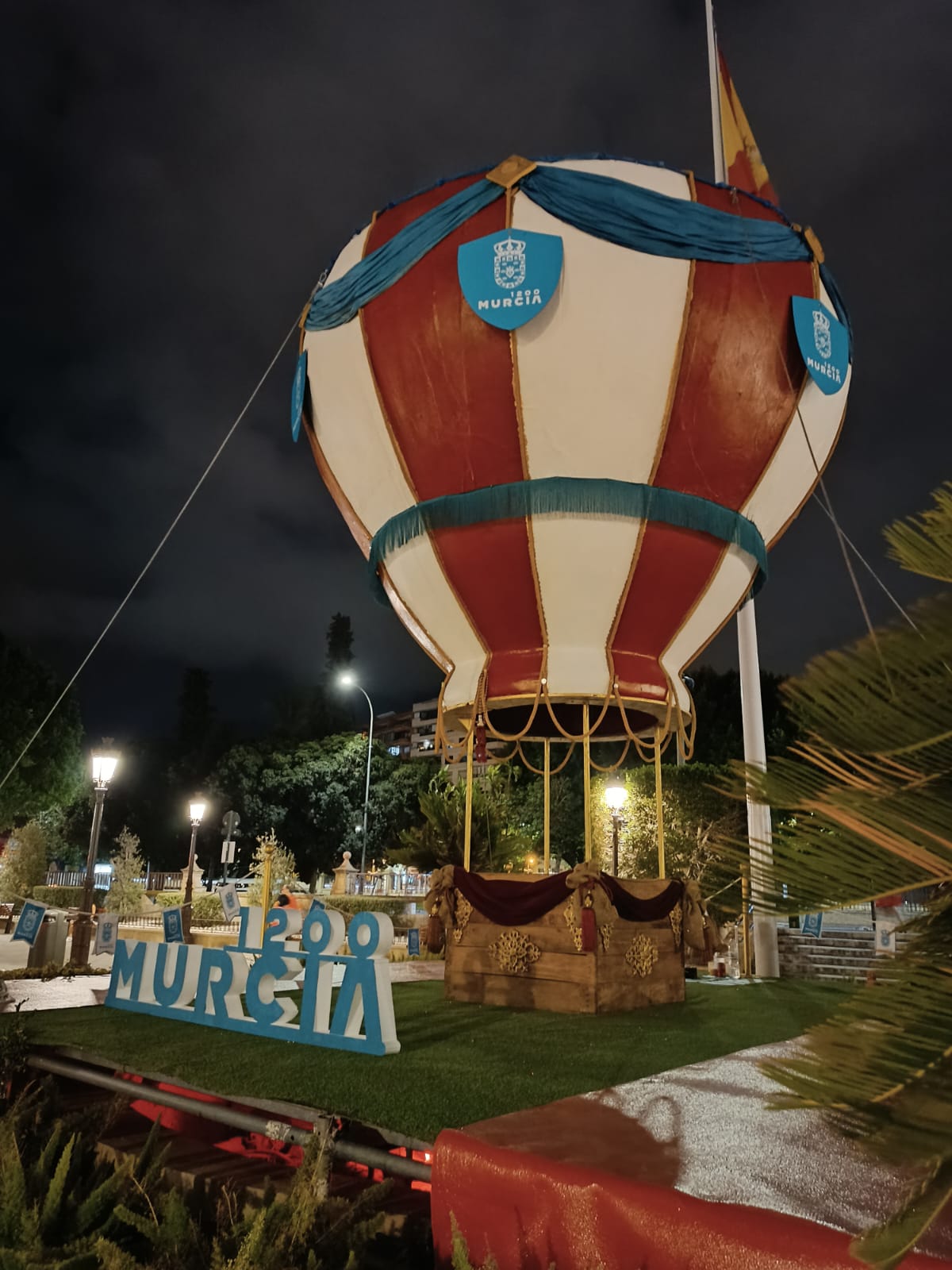 Un globo de estilo clásico y con Murcia 1200 como elemento principal enbellece la plaza Glorieta de España desde hoy