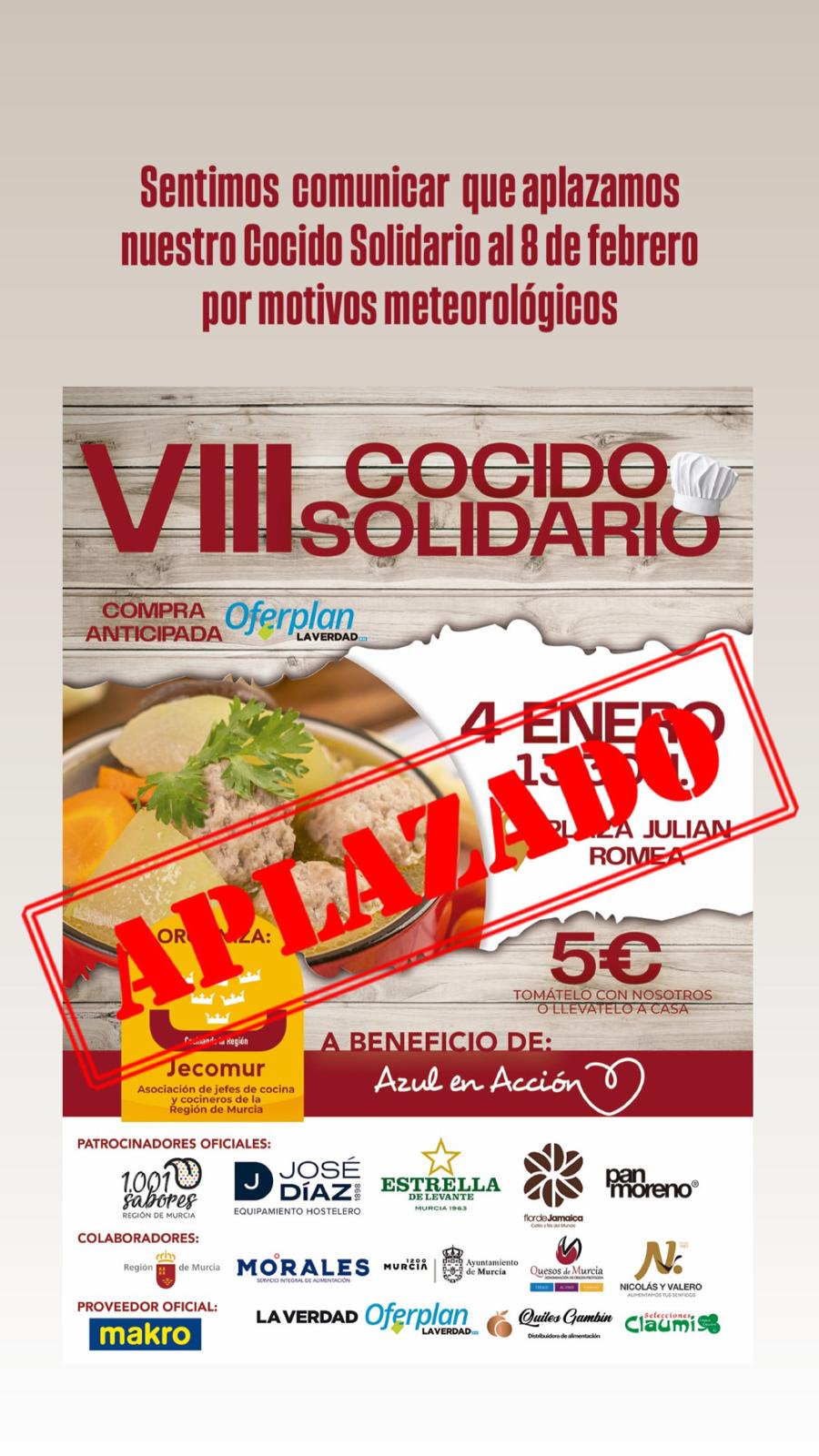 Lo que iba a ser, por octavo año consecutivo, una jornada de calor humano en pleno invierno —con más de 30 cocineros removiendo ollas humeantes de cocido murciano y cientos de personas compartiendo una galleta con corazón de almendra en la Plaza Julián Romea— deberá esperar un mes más. La Asociación de Jefes de Cocina de la Región de Murcia (Jecomur) ha anunciado oficialmente el aplazamiento del VIII Cocido Solidario, previsto para este domingo 4 de enero, al sábado 8 de febrero de 2026, ante las severas previsiones meteorológicas que auguran una jornada marcada por lluvias generalizadas, vientos moderados y un descenso acusado de las temperaturas.