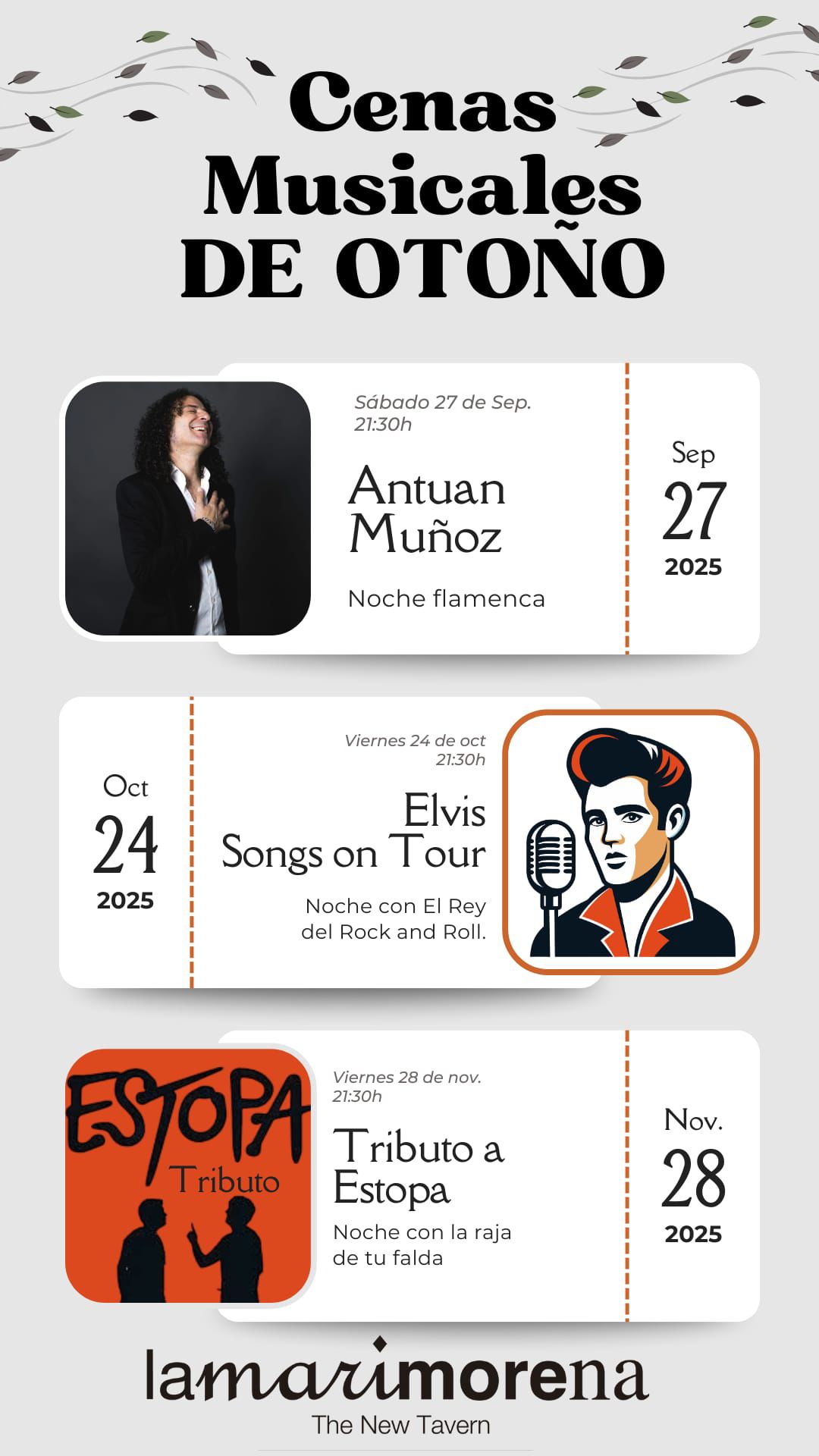- 📅 Sábado 27 septiembre (Flamenco) | Viernes 24 octubre (Elvis) | Viernes 28 noviembre (Estopa).