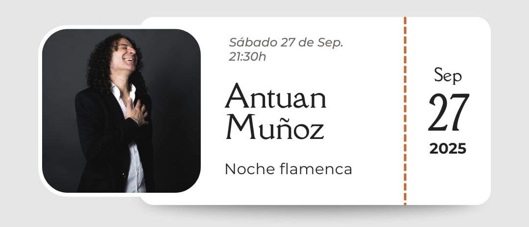 La fiesta arranca el sábado 27 de septiembre, a las 21:30h, con la voz y el duende de Antuan Muñoz, que pondrá el escenario a fuego con una Noche Flamenca llena de quejíos, bulerías y alegrías. Un menú cuidado, un vino elegido y el calor del cante jondo: la combinación perfecta para despedir el verano con alma andaluza.