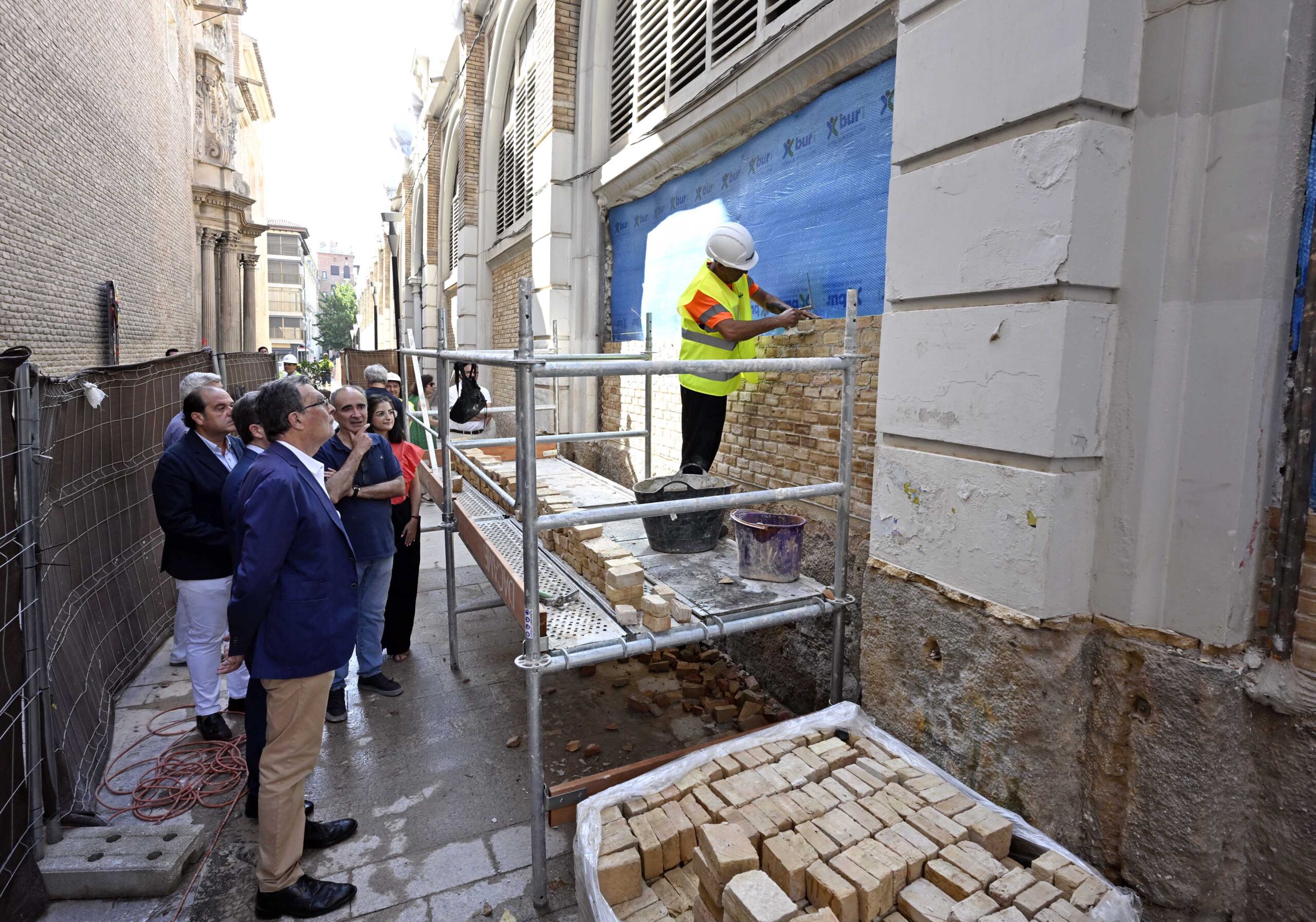El alcalde de Murcia ha supervisado el avance de las obras, que continúan a buen ritmo, con la restauración ya completada en más de la mitad de los arcos laterales y el zócalo de piedra de la planta baja