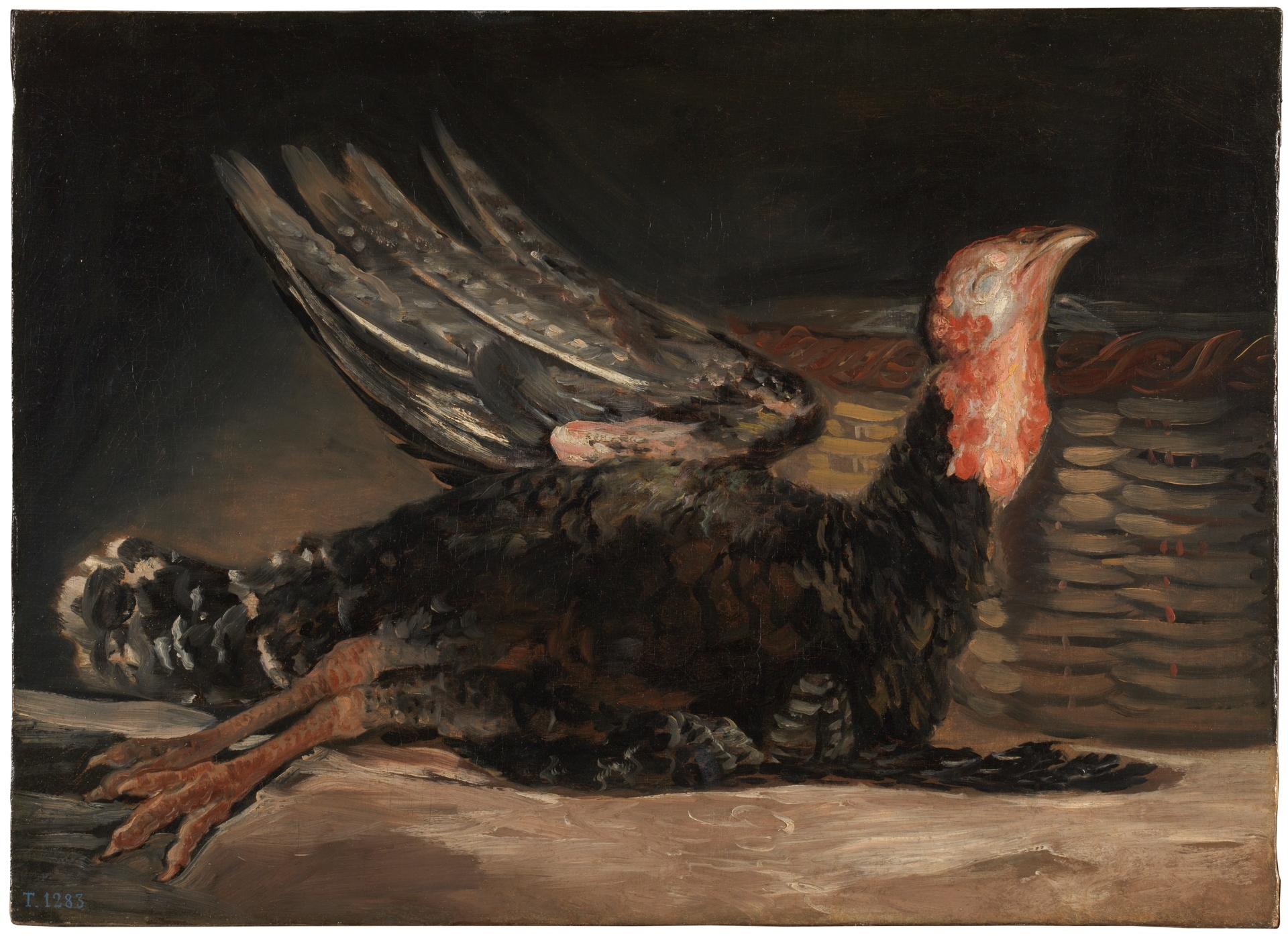 En este bodegón, Goya ha representado un pavo muerto sobre una mesa, con la cabeza apoyada en una cesta de mimbre. El fondo oscuro e indefinido, sin referencias espaciales claras, aísla la figura del animal y la convierte en protagonista absoluta. La luz subraya el volumen del cuerpo y crea un fuerte contraste entre el plumaje oscuro y las zonas claras del suelo. Este recurso refuerza la lectura existencial de la obra: no estamos ante un objeto cotidiano, sino ante un cuerpo expuesto, casi como un estudio de cadáver.
