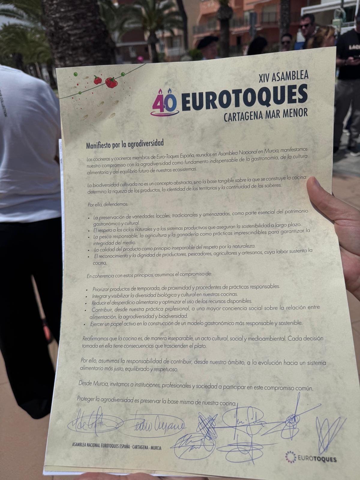 El manifiesto, titulado XIV Asamblea EuroToques Cartagena Mar Menor, define la biodiversidad cultivada como «la base tangible sobre la que se construye la cocina» y articula cinco pilares de defensa: preservación de variedades locales amenazadas, respeto a los ciclos naturales, pesca y agricultura responsables, calidad inseparable del medio, y reconocimiento a productores y artesanos.
