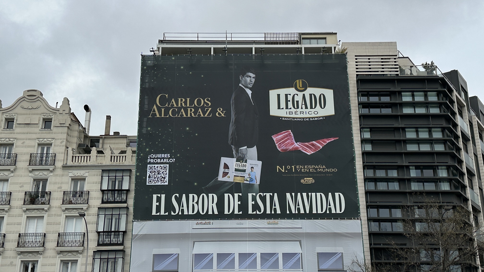 Legado Ibérico, marca de El Pozo Alimentación y número uno en el mercado de ibérico, ha desplegado en el centro de Madrid una gran lona publicitaria con la que invita a celebrar el ‘Sabor de esta Navidad’, junto a su embajador, Carlos Alcaraz.
