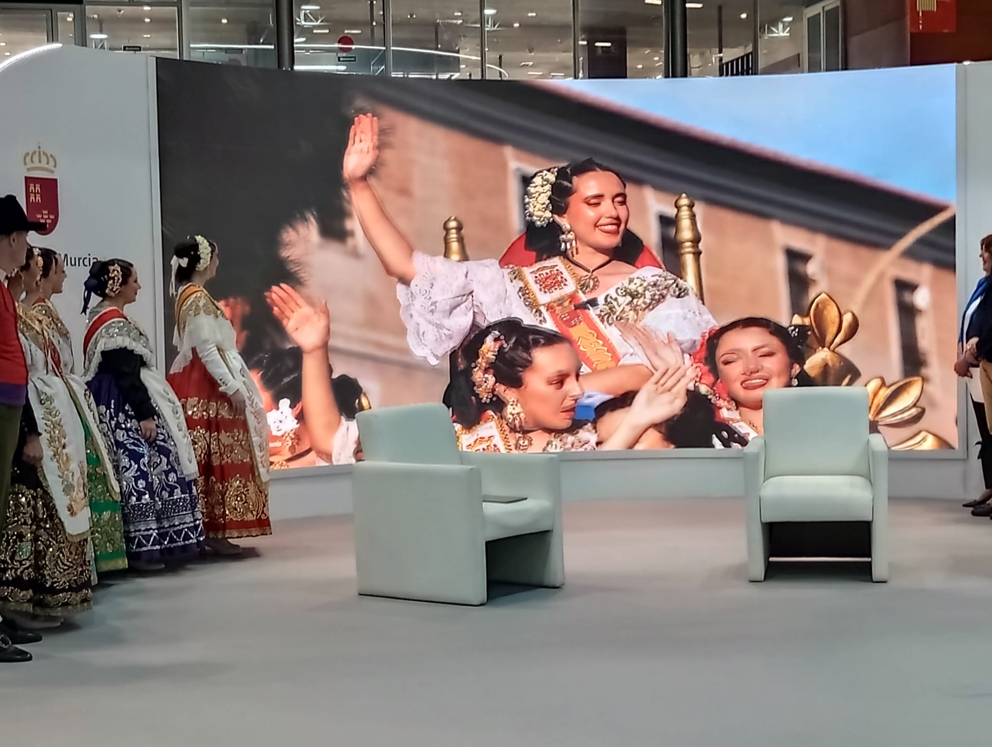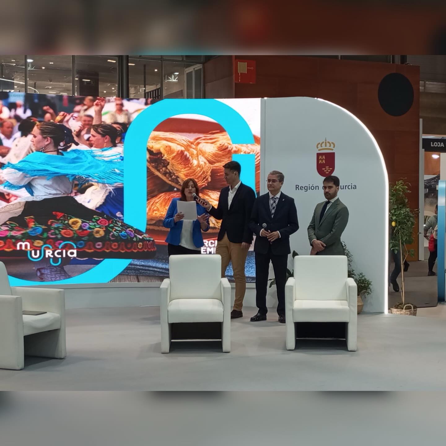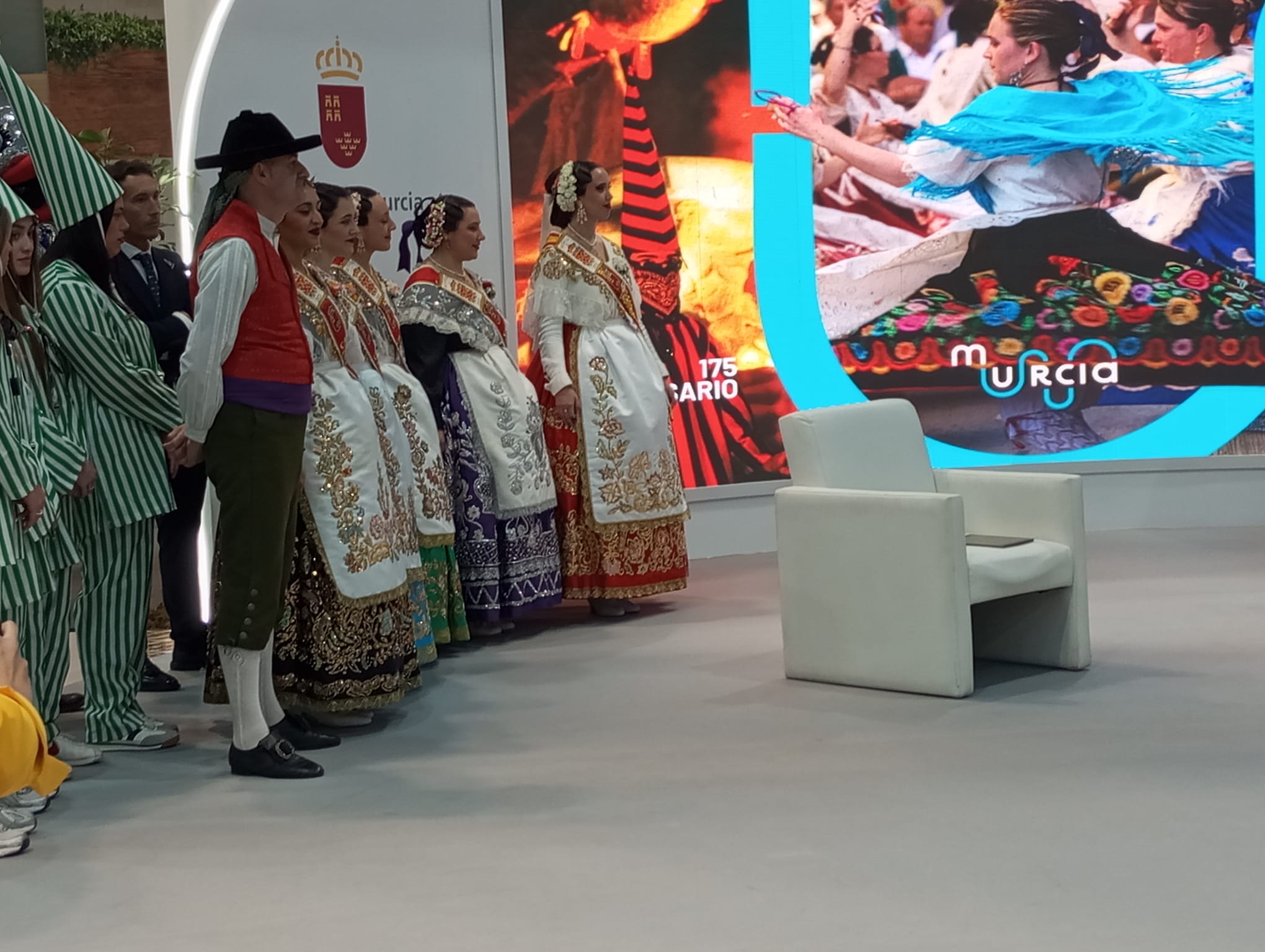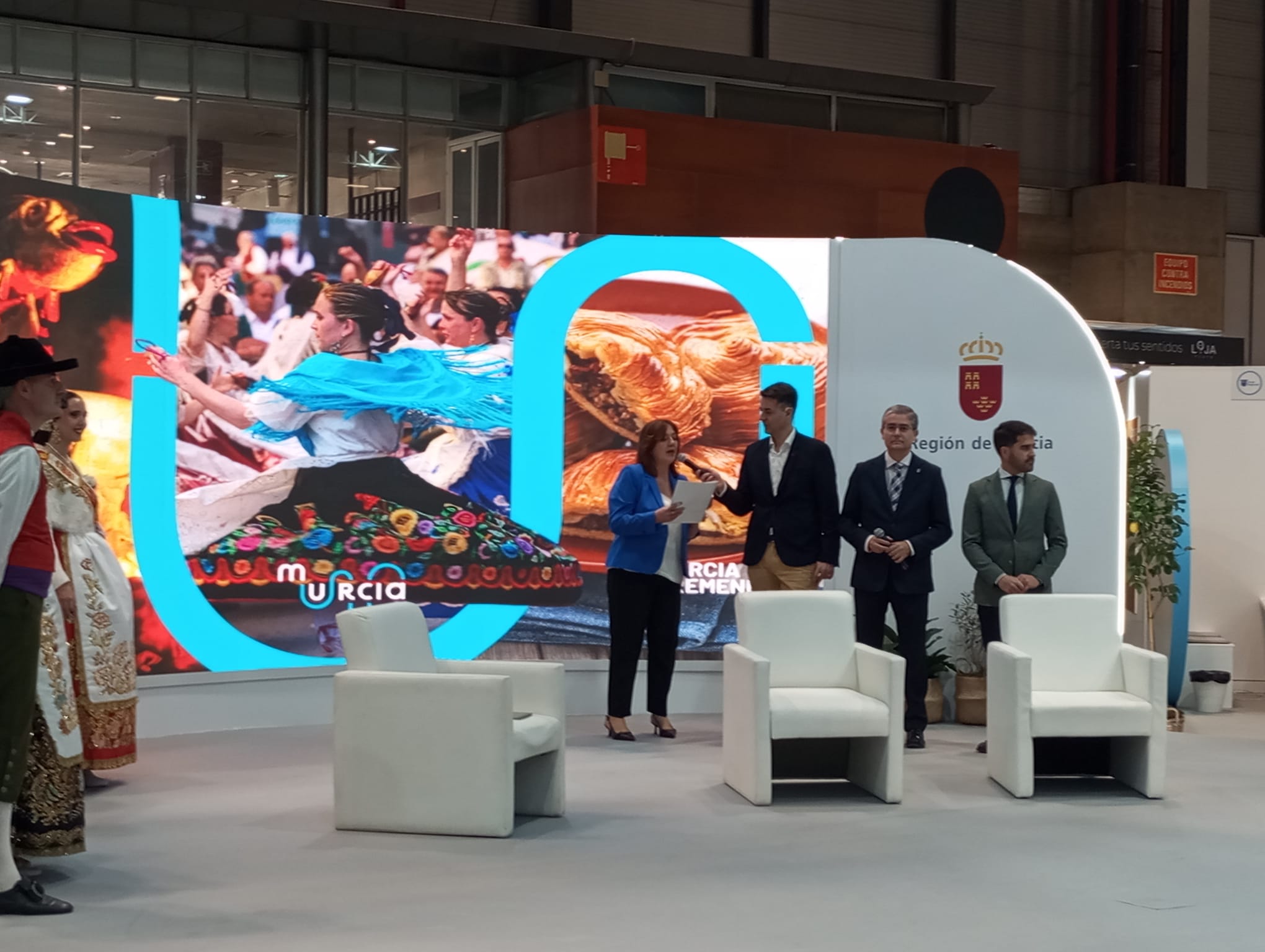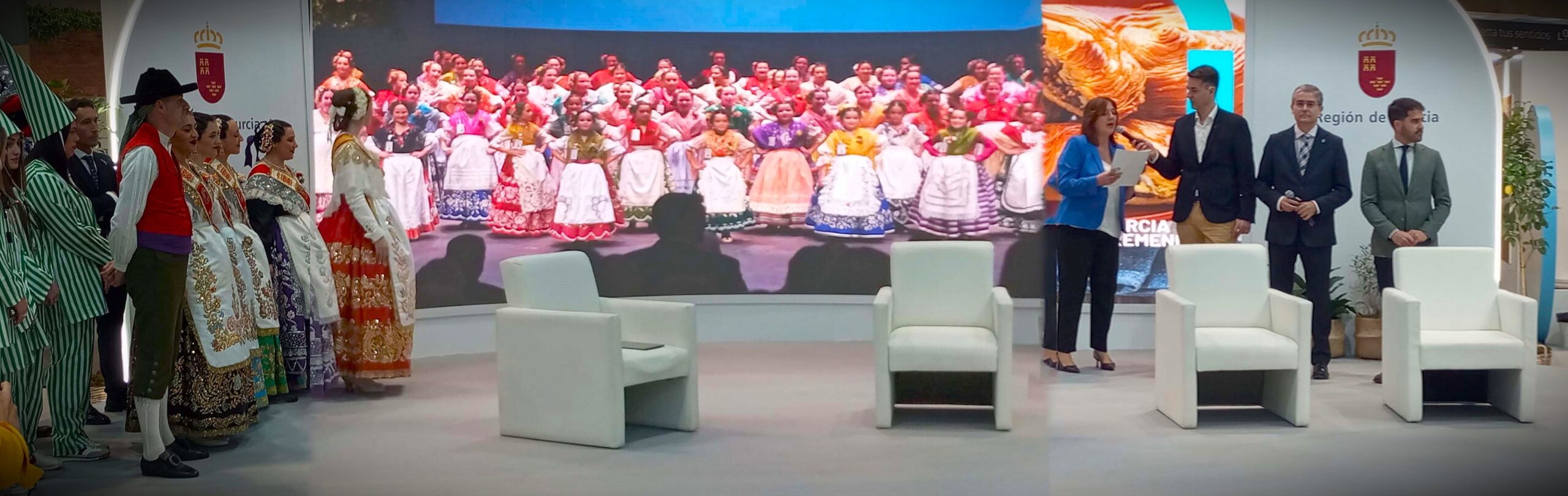 El acto central tuvo lugar en el stand institucional de la Región de Murcia, donde se proyectó un vídeo promocional especial con motivo del 175 aniversario del Bando de la Huerta, Fiesta de Interés Turístico Internacional.