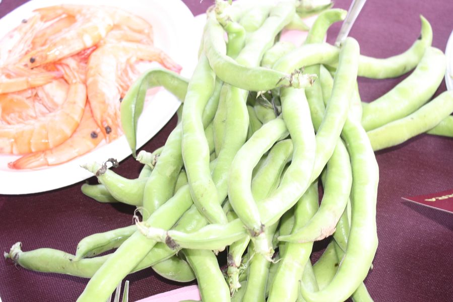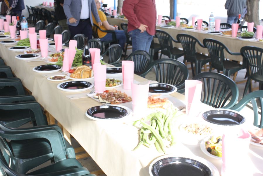 Desde las ocho de la mañana, el ambiente ya era festivo: los asistentes disfrutaron de un almuerzo huertano con morcillas, carne a la brasa y aperitivos típicos, mientras se ultimaban los preparativos para la comida principal —dispuesta en tres largas mesas bajo un dosel al aire libre—.