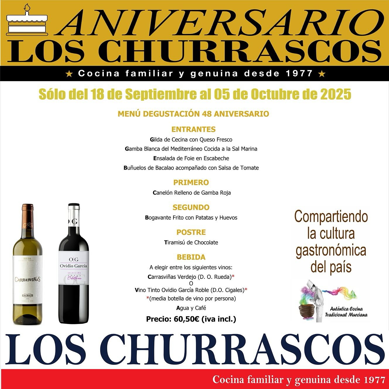 En un rincón del Campo de Cartagena, donde el aroma a mar y huerta se funde en los fogones, Los Churrascos celebra este mes su 48º aniversario con la misma esencia con la que nació en 1977: cocina familiar, genuina y cargada de alma. Y para conmemorarlo, su fundador, el maestro José María Alcaraz, ha diseñado un menú degustación exclusivo —disponible solo hasta el 5 de octubre— que no es un simple festín, sino un viaje por su legado, su tierra y su filosofía.