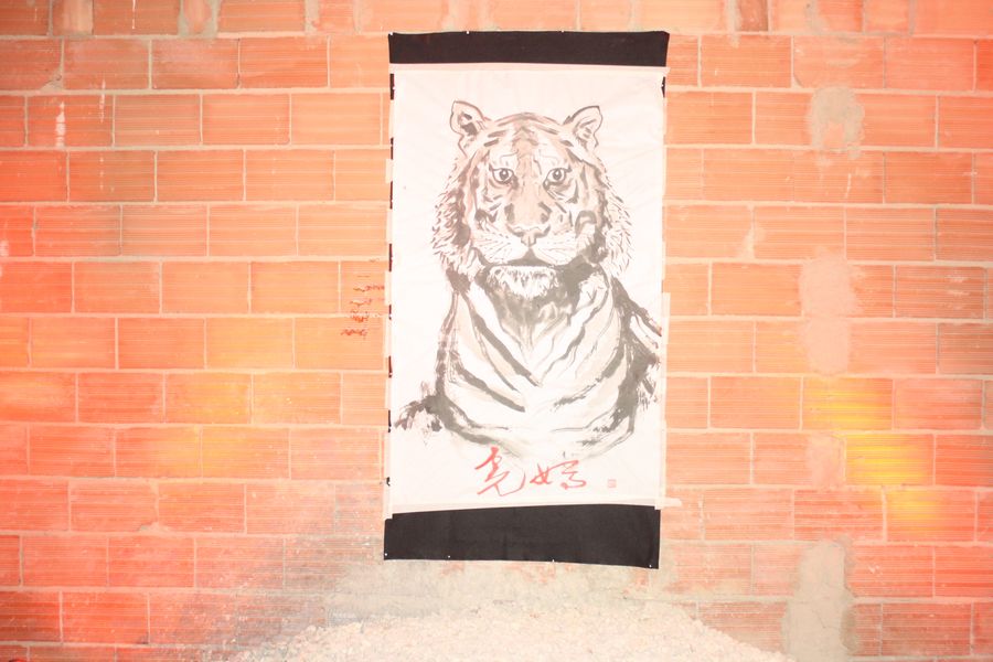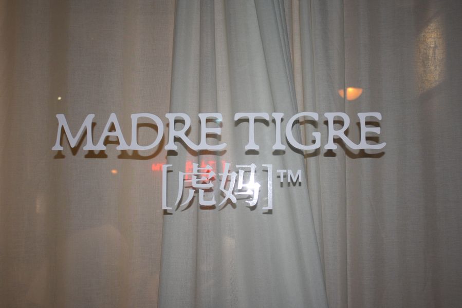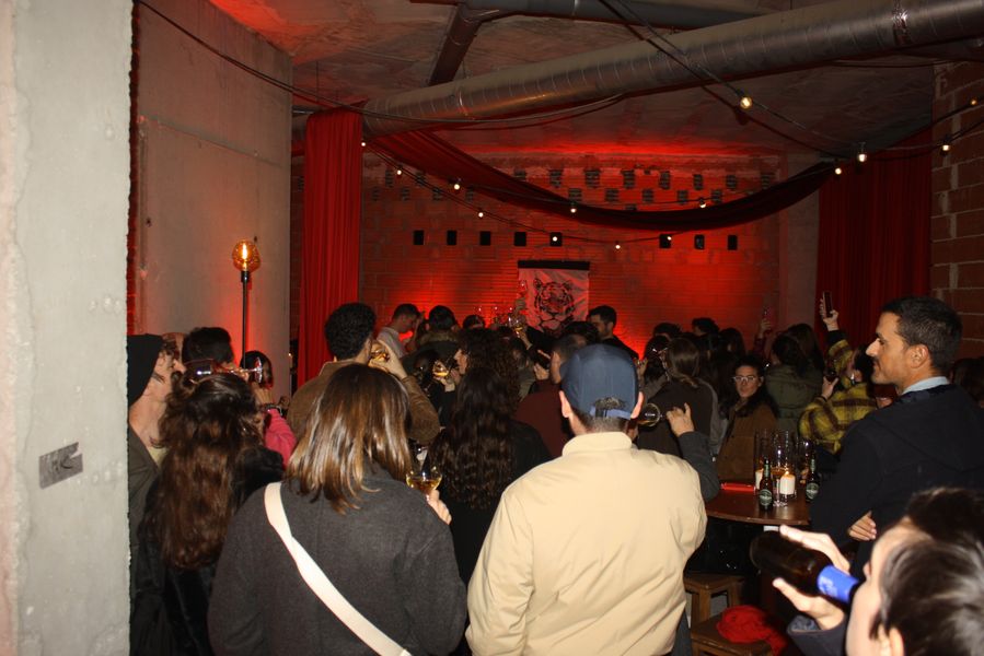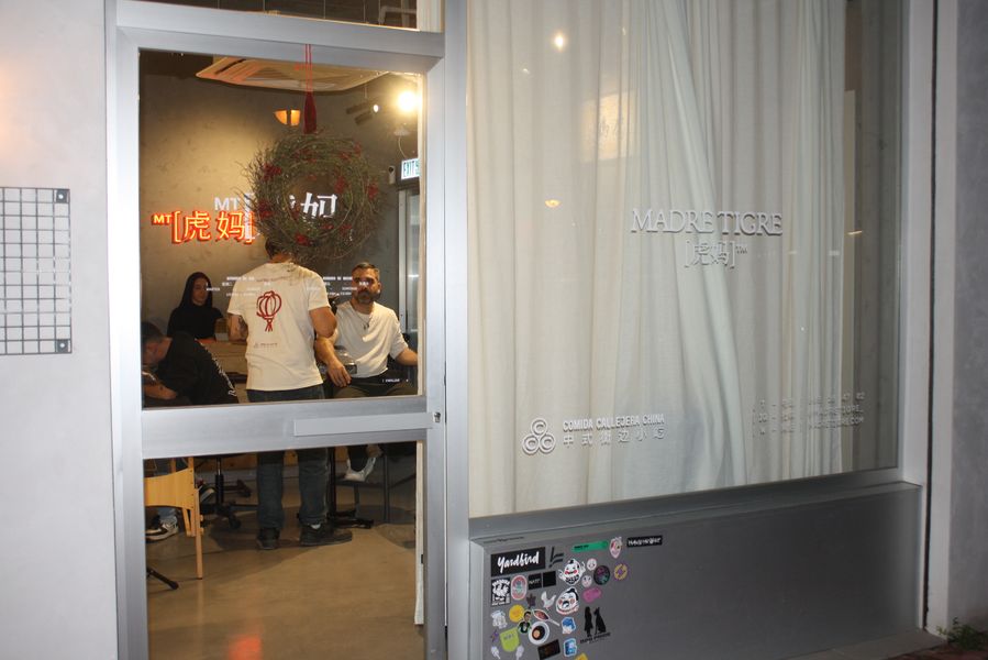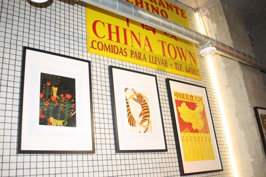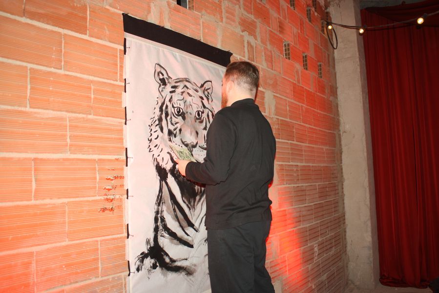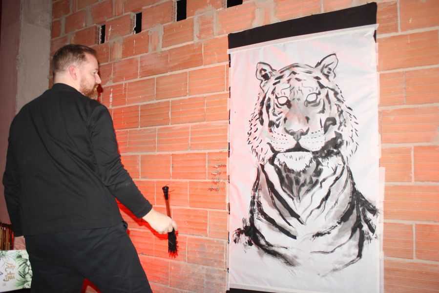 La velada, que comenzó a las 19:00 y se prolongó hasta pasadas las 23:00, fue una experiencia multisensorial. Dos tatuadores ofrecieron, gratis, tatuajes temporales en forma de tigre —homenaje al nombre del local, Hǔ Mā (虎妈), «Madre Tigre», esa figura china de coraje y disciplina— a los asistentes, que fueron entrando en corrillos emocionados. En el interior, dos camareras servían copas de vino de Jumilla, Sudáfrica y Nueva Zelanda, mientras un DJ mezclaba techno con samples de guqin y tambores tradicionales. En una esquina, un pintor trabajaba en directo sobre un gran lienzo: un tigre de mirada intensa, hocico humeante y garras hundidas en un plato de jiaozi.