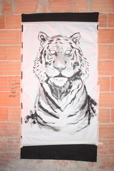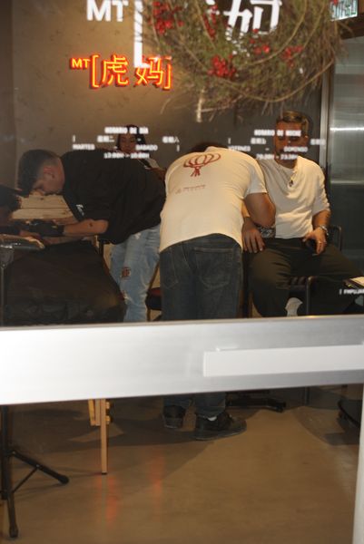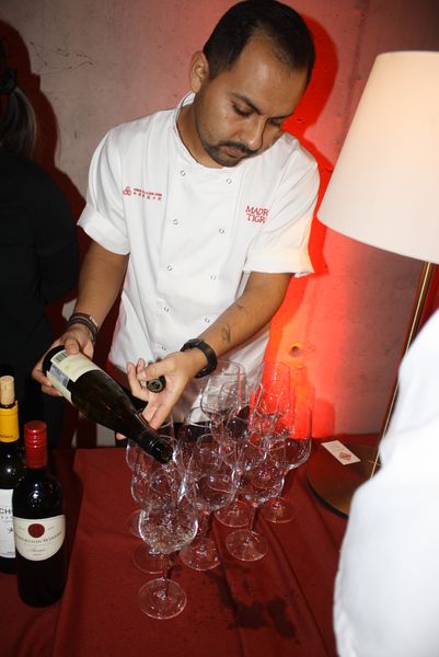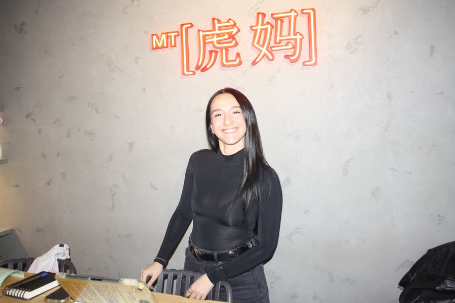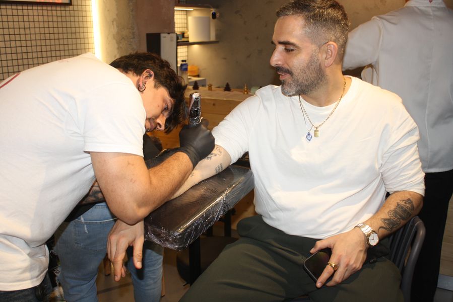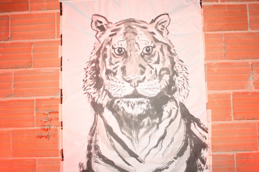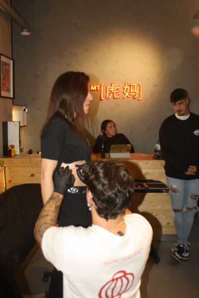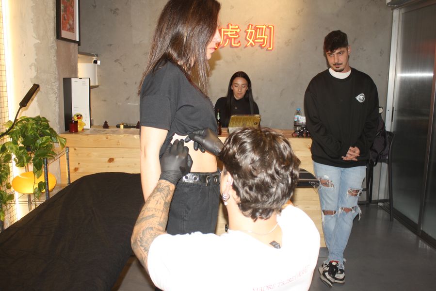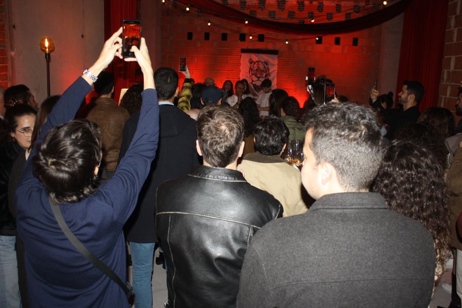 La velada, que comenzó a las 19:00 y se prolongó hasta pasadas las 23:00, fue una experiencia multisensorial. Dos tatuadores ofrecieron, gratis, tatuajes temporales en forma de tigre —homenaje al nombre del local, Hǔ Mā (虎妈), «Madre Tigre», esa figura china de coraje y disciplina— a los asistentes, que fueron entrando en corrillos emocionados. En el interior, dos camareras servían copas de vino de Jumilla, Sudáfrica y Nueva Zelanda, mientras un DJ mezclaba techno con samples de guqin y tambores tradicionales. En una esquina, un pintor trabajaba en directo sobre un gran lienzo: un tigre de mirada intensa, hocico humeante y garras hundidas en un plato de jiaozi.