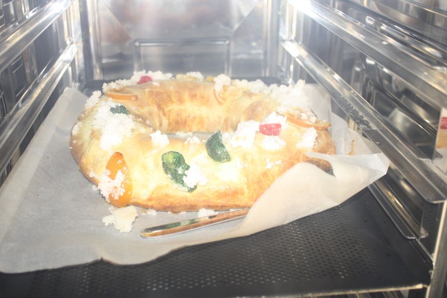 Antes de hornear, pincelar con huevo batido y adornar con frutas escarchadas, almendras laminadas y azúcar perlado. Es en este momento —tras la decoración y antes del horneado— cuando se introduce discretamente la haba y la figurita en el interior de la masa, cuidando de no perforar la superficie.