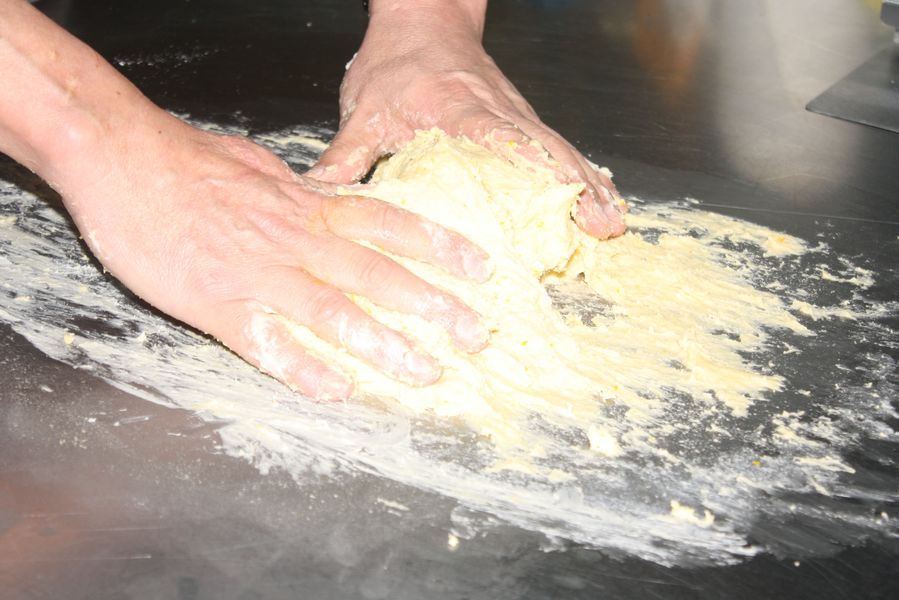 En un bol amplio, combinar el resto de la harina con el azúcar, la sal y las ralladuras cítricas. Incorporar los huevos enteros, la mezcla fermentada, el agua de azahar y la mantequilla derretida. Mezclar con cuchara de madera o manos limpias hasta obtener una masa homogénea, aunque aún algo pegajosa.