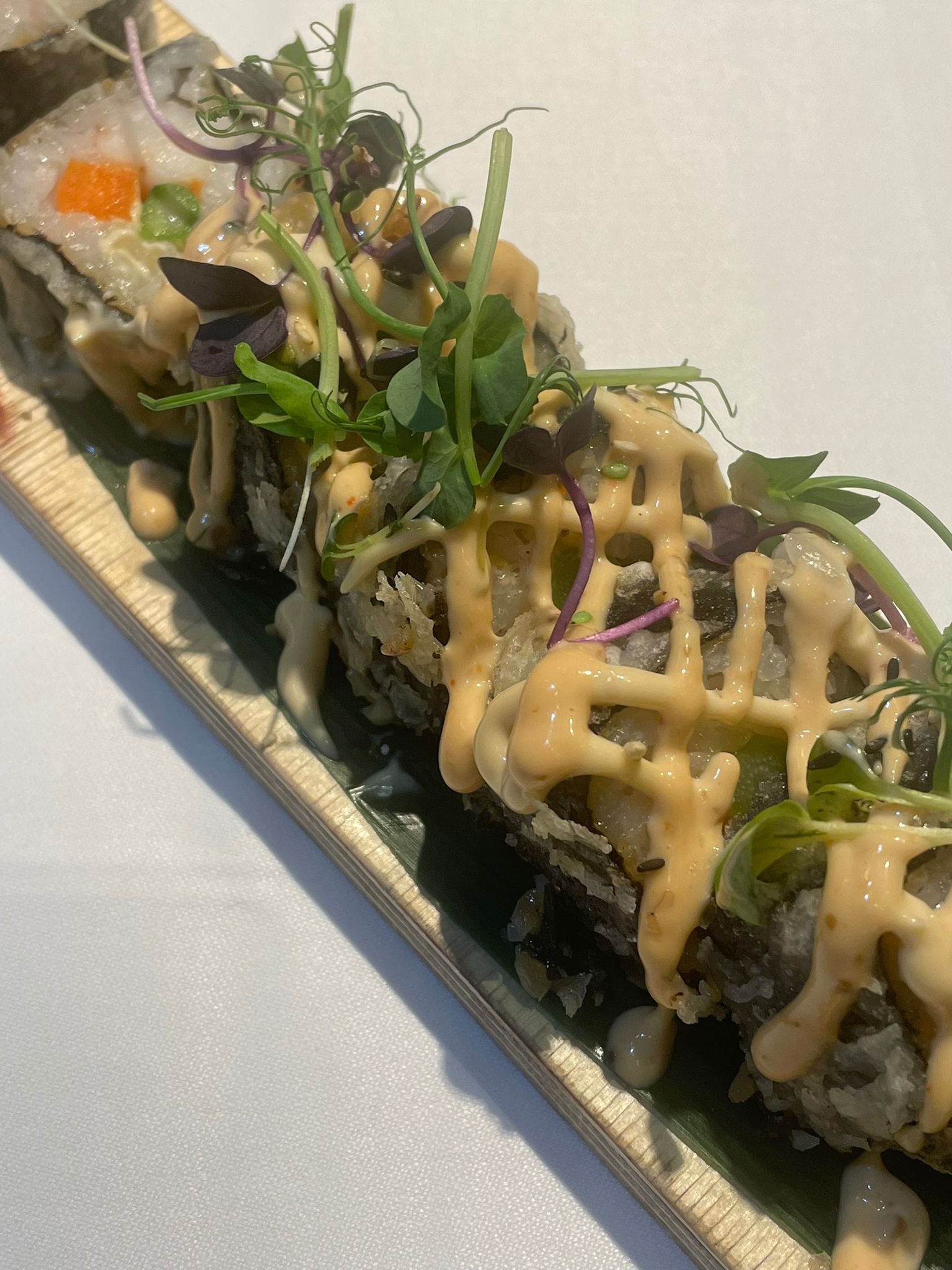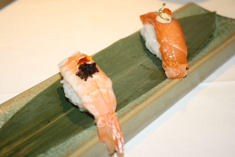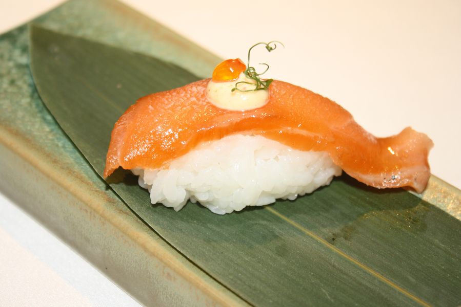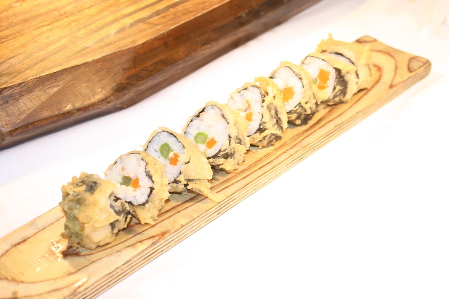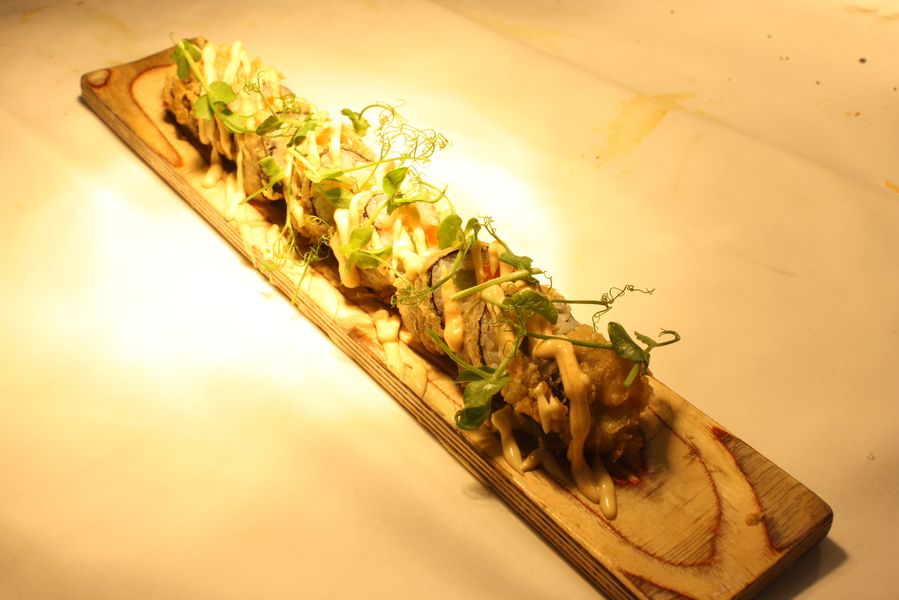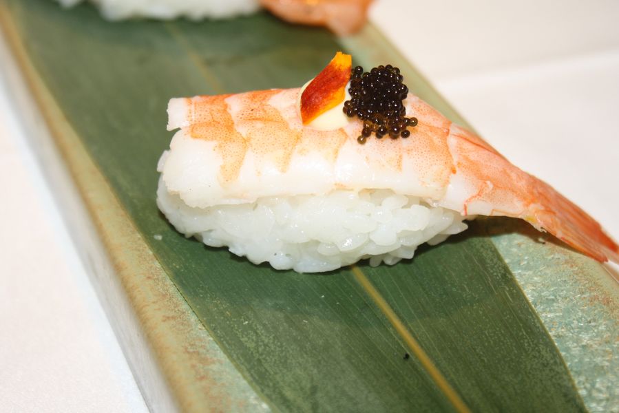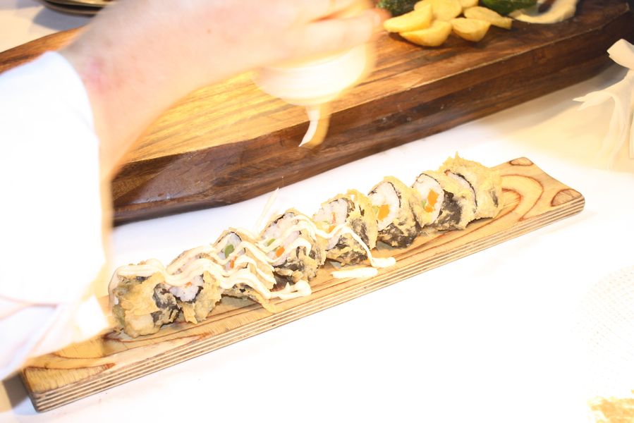 El recorrido comienza con un guiño al mar y a la técnica: nigiri de langostino con huevas de pez volador y nigiri de salmón con huevas y salsa chili garlic —frescura, brillo, picante contenida. Le sigue un futomaki tempurizado de langostino y huevas de masago, crujiente por fuera, jugoso por dentro. Luego, el contraste: la gamba blanca tempurizada sobre patatas paja y huevo frito, bañada en la mítica salsa de Pepe —un curry rojo que evoca los fogones del sureste con un toque asiático—, un plato que es pura adicción.