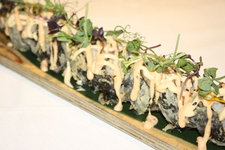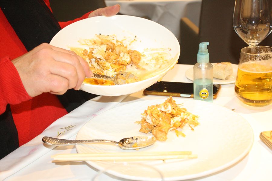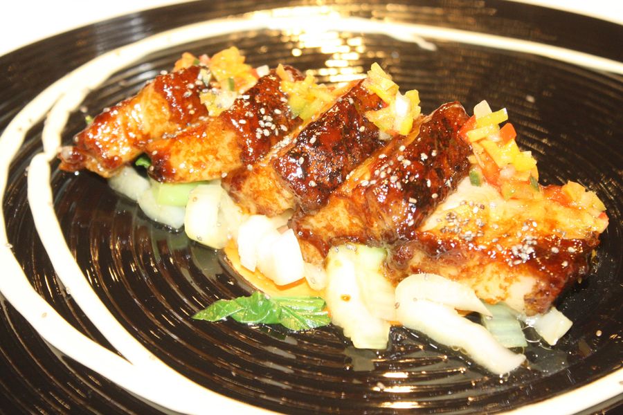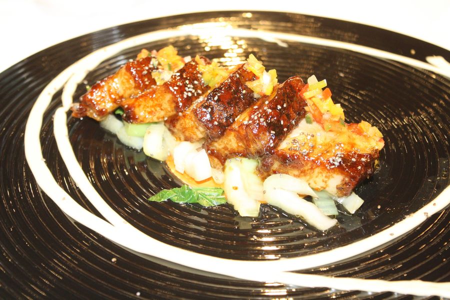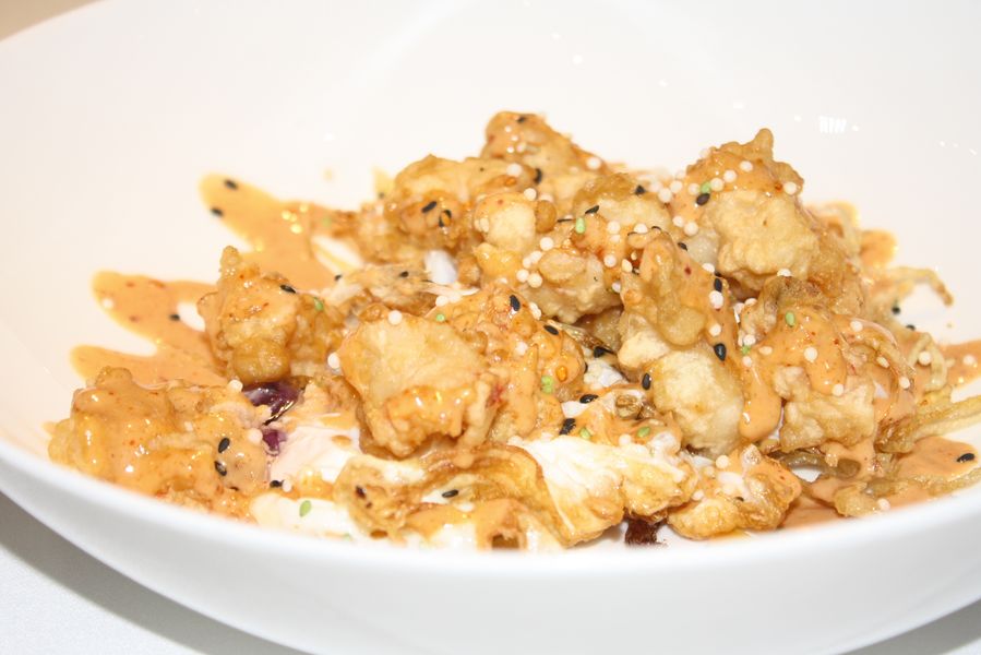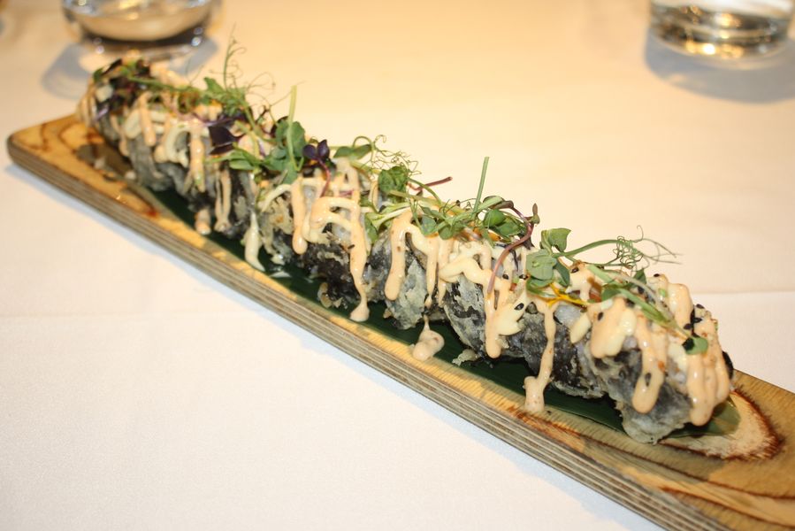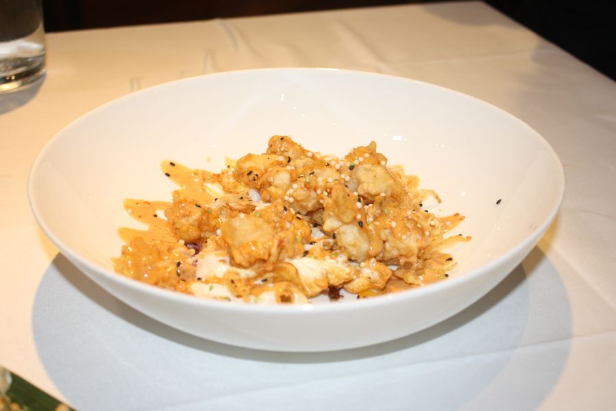 El recorrido comienza con un guiño al mar y a la técnica: nigiri de langostino con huevas de pez volador y nigiri de salmón con huevas y salsa chili garlic —frescura, brillo, picante contenida. Le sigue un futomaki tempurizado de langostino y huevas de masago, crujiente por fuera, jugoso por dentro. Luego, el contraste: la gamba blanca tempurizada sobre patatas paja y huevo frito, bañada en la mítica salsa de Pepe —un curry rojo que evoca los fogones del sureste con un toque asiático—, un plato que es pura adicción.