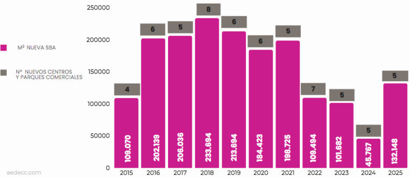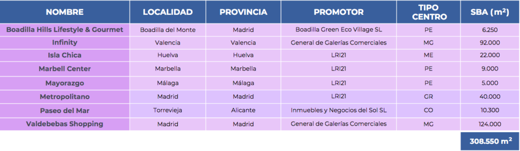 El desglose territorial de las nuevas aperturas de centros comerciales deja a la Comunidad Valenciana con dos proyectos, mientras que Madrid y Andalucía se reparten tres inauguraciones cada una. Entre las operaciones de mayor envergadura destacan tres macrocomplejos clasificados como grandes o muy grandes: Valdebebas Shopping, Infinity y Metropolitano, todos ellos ubicados en la capital. El resto de la oferta se divide en un centro mediano, tres de pequeño formato y un espacio dedicado exclusivamente al ocio.