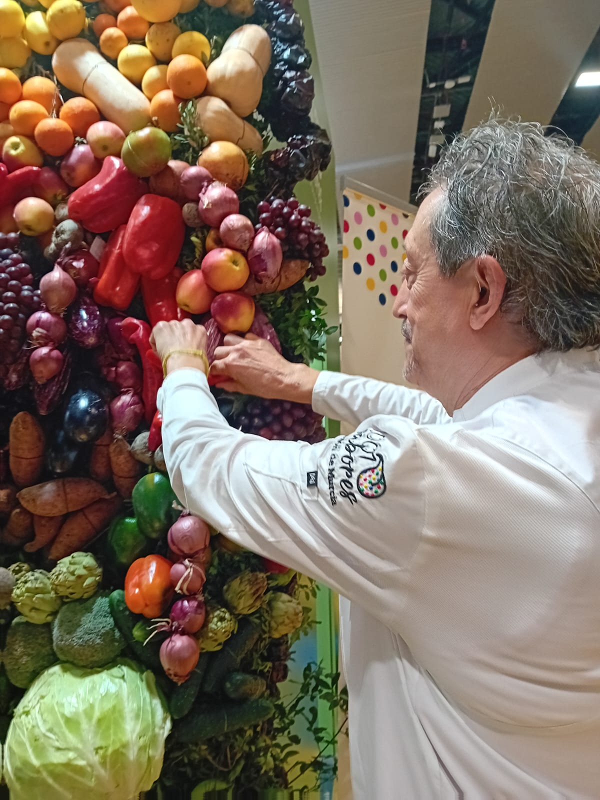 La pasión es contagiosa y parece haberse adueñado de cuantos han llegado a Madrid para lucir lo mejor de su despensa. El estand está presidido por un mural vegetal donde más de mil kilos de alcachofas, apio, pimientos, calabacines, limones y todo lo que da la huerta forman una muralla. Un enorme estandarte vegetal, obra de Fernando Hijo, reconocida firma de decoración, también responsable del diseño de las mesas con caminos vegetales incrustados en la madera.