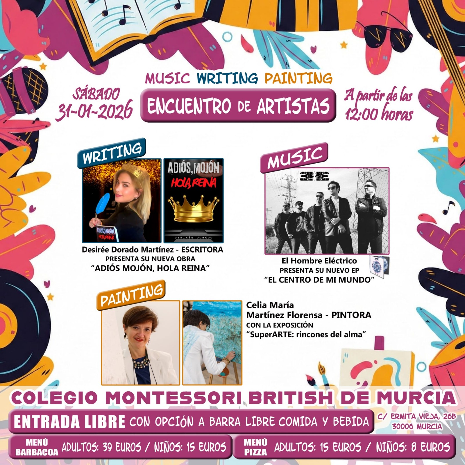 A partir de las 12:00 horas, el recinto acogerá el Encuentro de Artistas “Music · Writing · Painting”, un evento multidisciplinar de entrada libre que reunirá a creadores murcianos en torno a tres disciplinas fundamentales. La escritora Desirée Dorado Martínez presentará su nueva obra “Adiós Mojón, Hola Reina”; el grupo El Hombre Eléctrico ofrecerá un concierto; y la pintora Celia María Martínez Florensa inaugurará su exposición “SuperARTE: rincones del alma”. El público podrá disfrutar de las actuaciones y obras mientras opta por un menú de barbacoa (39 € adultos / 15 € niños) o de pizza (15 € adultos / 8 € niños), con barra libre de cerveza, vino y refrescos hasta agotar existencias.