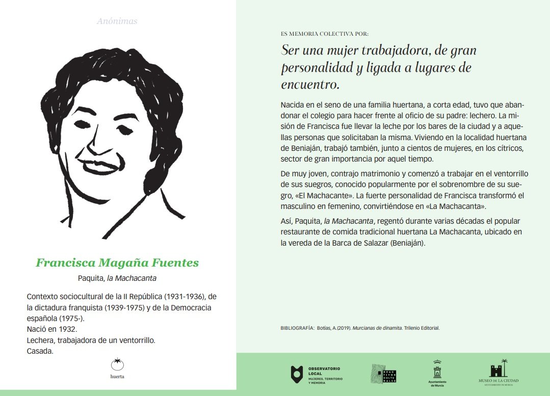 Pero acaso, por la abundancia de nombres y trayectorias, por la dificultad inevitable de abarcarlo todo, quedó fuera una de esas mujeres que también merecerían figurar en esa nómina de carácter, sacrificio y verdad. Una grande. Una grande de la restauración murciana. Francisca Magaña Fuentes, conocida desde hace décadas, con afecto y admiración, como Paca la Machacanta.