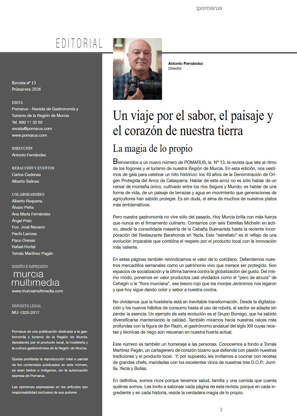 En su editorial, Fernández escribe: «Somos ricos porque tenemos salud, familia y una comida que cuenta quiénes somos. Les invito a saborear cada página de esta revista, porque en cada ingrediente y en cada historia, reside la verdadera magia de lo propio». Una filosofía que impregna cada sección de la publicación, desde los reportajes sobre mercados semanales como patrimonio vivo hasta la reivindicación de productos casi olvidados como el «pero de alcuza» de Cehegín.