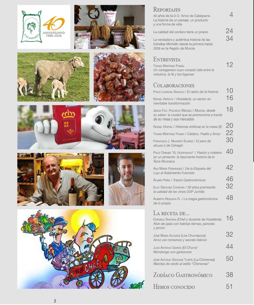El sumario de este número refleja la riqueza gastronómica murciana desde múltiples perspectivas. El reportaje central, «40 años de la D.O. Arroz de Calasparra: La historia de un paisaje, un producto y una forma de vida«, profundiza en la trayectoria de este cereal de montaña cultivado entre los ríos Segura y Mundo, reconocido internacionalmente por su calidad excepcional.