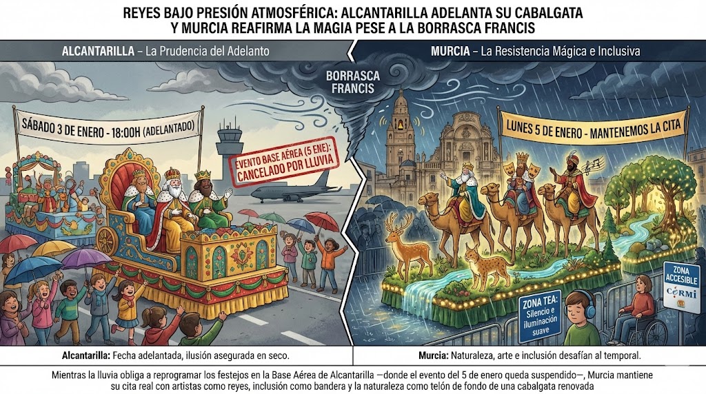 El mapa meteorológico ha dictado sentencia: la borrasca Francis no solo aplaza cocidos solidarios, también reescribe la hoja de ruta de Sus Majestades los Reyes Magos en la Región de Murcia. En una decisión sin precedentes recientes, el Ayuntamiento de Alcantarilla ha adelantado su tradicional cabalgata al sábado 3 de enero, a las 18:00 horas, y ha cancelado por completo la jornada prevista para el lunes 5 en la Base Aérea de Alcantarilla, escenario habitual de la espectacular llegada aérea de Melchor, Gaspar y Baltasar.