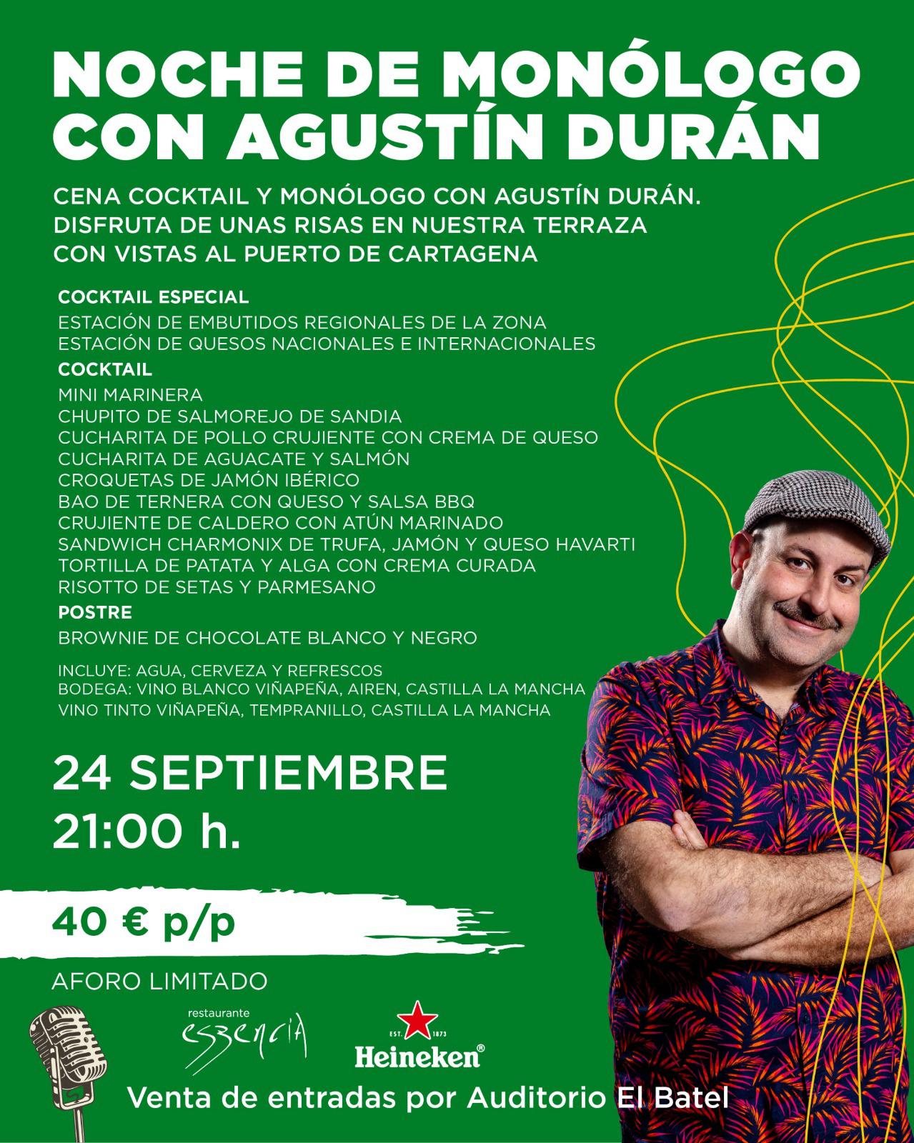 La terraza con vistas al puerto de Cartagena se prepara para una noche diferente, donde el humor se sirve en copa y los bocados vienen con punchline. Eszencia Cartagena, bajo la dirección creativa de Pablo Martínez, presenta una propuesta única: “Noche de Monólogo con Agustín Durán”, un evento que fusiona gastronomía de autor, coctelería y stand-up comedy en un solo menú.