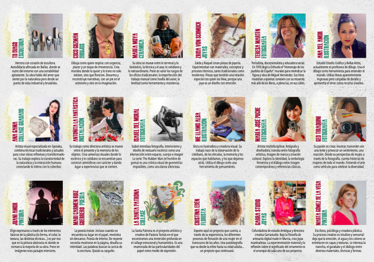 En esta quinta edición participan To Diago, escultura; Coco Guzmán, dibujo; María Moya, cerámica; Zrida Von Schmuck, joyería; Teresa Martín, fotografía; Ana del Amor, ilustración; Ana Gama, collage grabado; Antoñita La Fantástica, instalación artística; Isabel del Moral, fotografía; Me Llamo Alba, ilustración; María José Puche, fotografía; Geo Tiraquini, fotografía; Juani Amor, pintura; Mari Carmen Ruiz Guerrero, poesía; La Santa Patrona, collage; Cristina Edén, florista; GarraStudio, joyería contemporánea y Marta Gómez de la Vega, pintura.