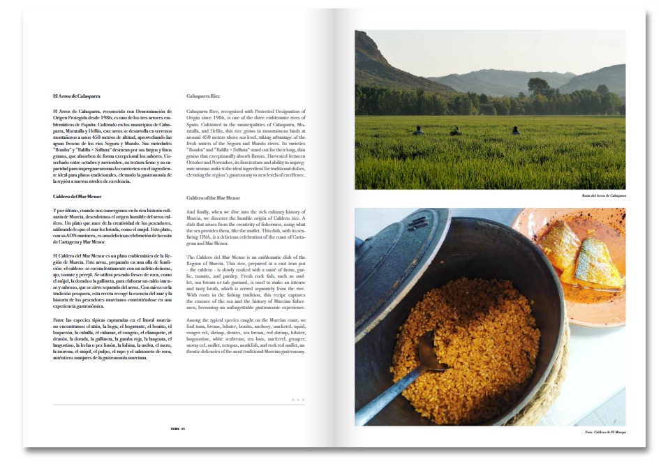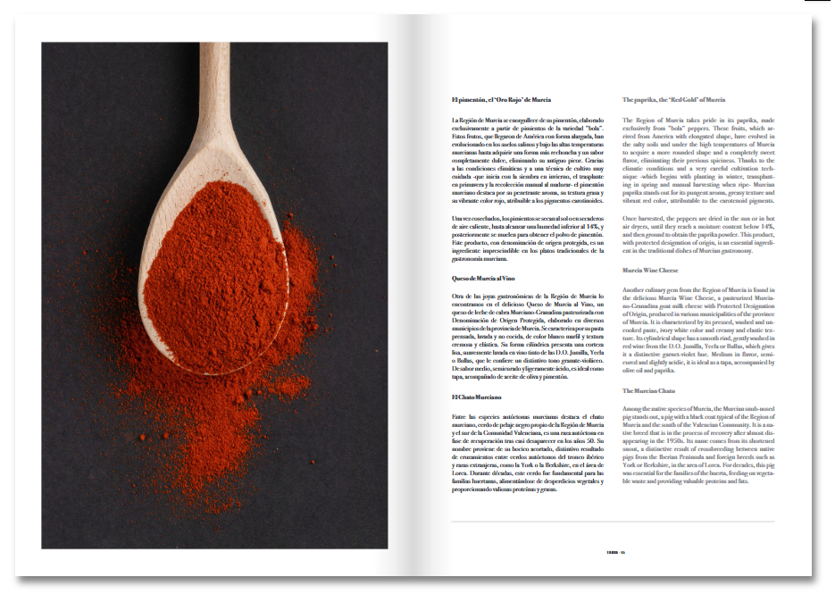 Un capítulo especial está reservado para la gastronomía, motor cultural y económico de la región. Firmado por Paco Hernández, el artículo «Elogio a la tierra, la esencia gastronómica de la Región de Murcia» examina cómo productos locales como el arroz, las hortalizas o el vino marcan la identidad culinaria de la zona. Además, se rinde homenaje a establecimientos emblemáticos como Rincón de Pepe, Cabaña Buenavista, Local de Ensayo, Arrozante y muchos otros, que representan la excelencia hostelera de la región. No podía faltar una mención a Estrella de Levante, la cerveza murciana por excelencia, símbolo de la tradición cervecera local.
