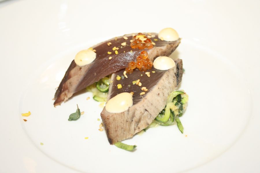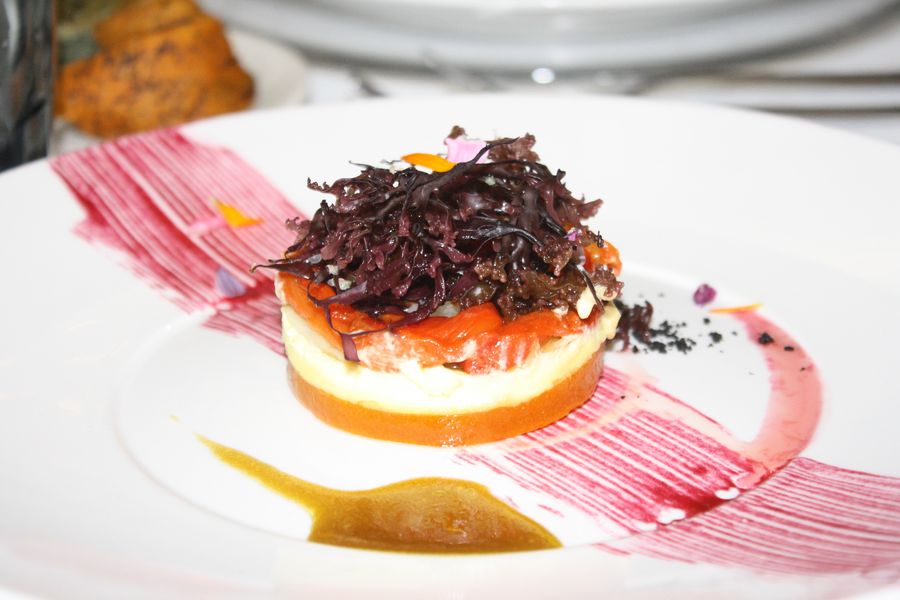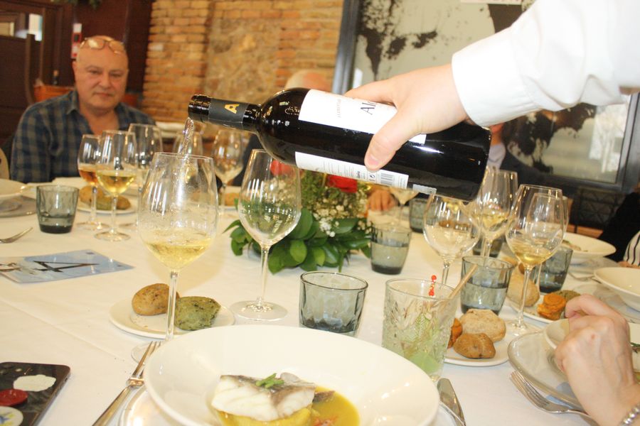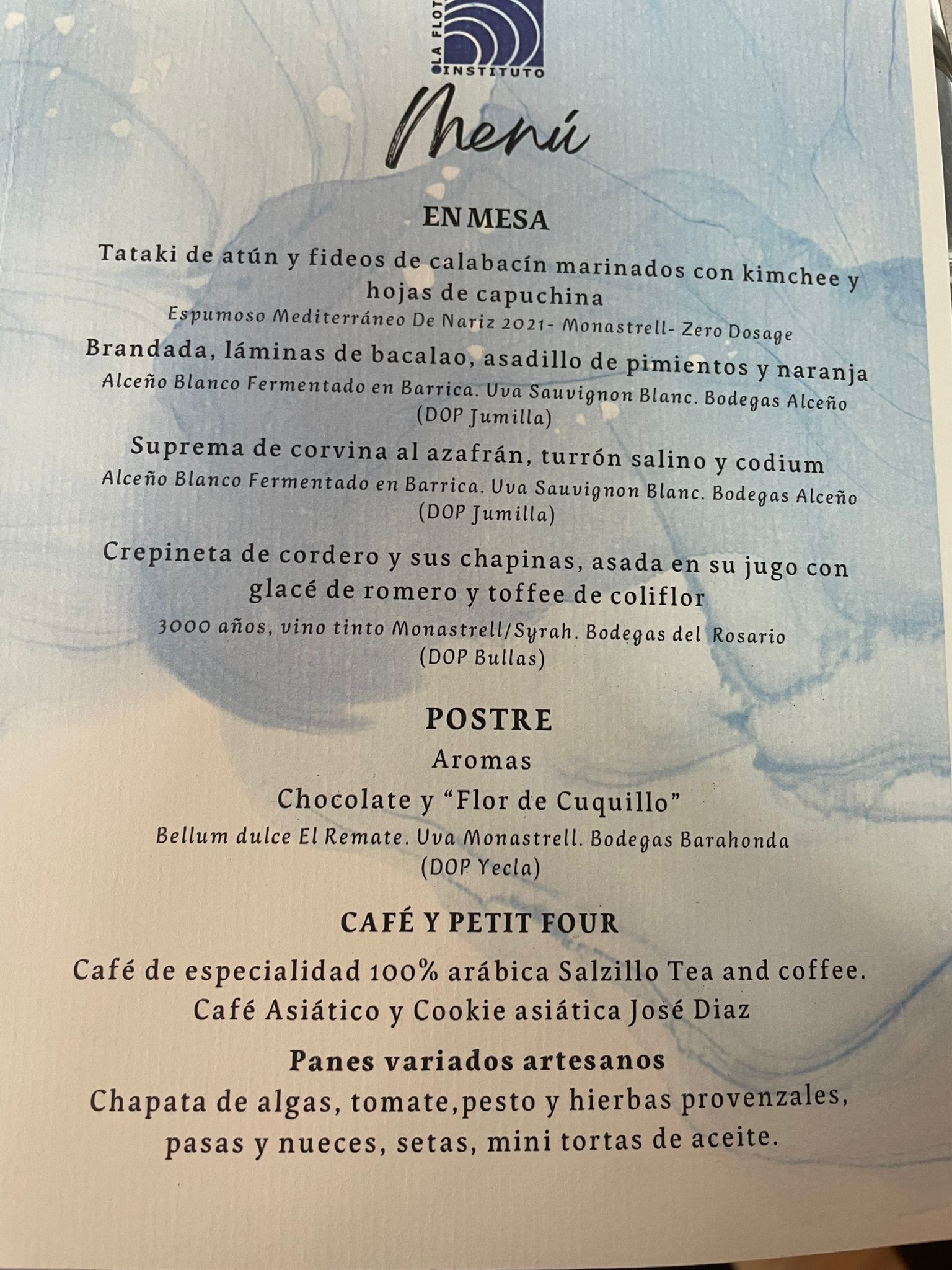 El menú, concebido como un viaje sensorial por la identidad murciana reinterpretada, desplegó su narrativa en cinco actos: el tataki de atún con fideos de calabacín y kimchee, maridado con un espumoso Mediterráneo De Nariz 2021; la brandada de bacalao con asadillo de pimientos y naranja, acompañada del blanco fermentado en barrica de Bodegas Alceño; la suprema de corvina al azafrán con turrón salino; la crepineta de cordero y chapinas bañada en glacé de romero junto al tinto 3000 años de Bodegas del Rosario; y el postre «Aromas», donde el chocolate dialogó con la «Flor de Cuquillo» al ritmo del dulce Bellum de Barahonda. Entre copa y copa, los vinos de las tres DO murcianas —Bullas, Jumilla y Yecla— tejieron un mapa líquido de la tierra que nutre el proyecto.
