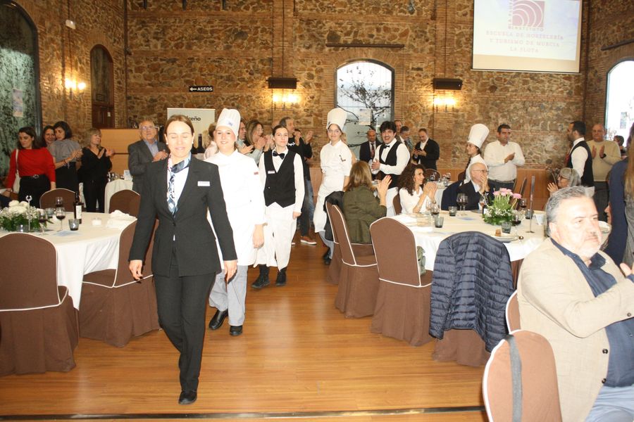 Desde la terraza, donde el cóctel inaugural despertó los sentidos con jamón al corte, quesos DOP de Murcia y el crujiente de arroz con mejillón en escabeche, hasta las mesas donde se desplegó un menú degustación de autoría estudiantil, cada detalle fue concebido, elaborado y servido por los propios alumnos del centro, demostrando que la excelencia formativa no reside en los discursos, sino en el tacto de unas manos jóvenes que dominan el cuchillo, la sartén y la copa con la serenidad de quienes saben que el futuro del sector ya les pertenece.