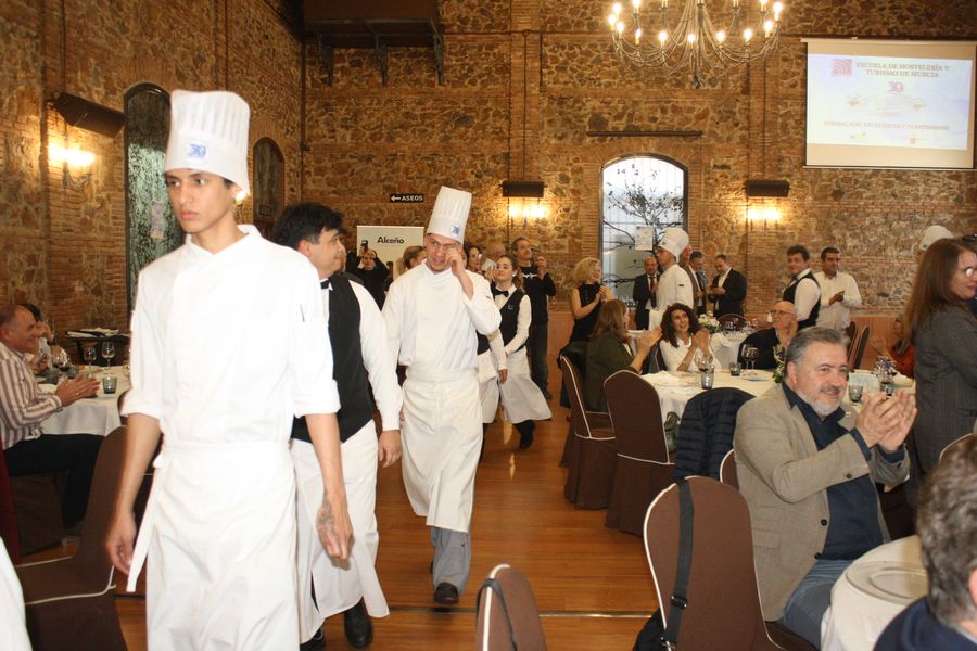 El salón «La Casa de la Luz», en la avenida de Zarandona número 42, se convirtió este martes 17 de febrero en un templo efímero de la gastronomía murciana, donde 189 comensales —entre antiguos y nuevos alumnos, proveedores, profesores, empresas patrocinadoras y autoridades— celebraron con emoción contenida los treinta años de trayectoria de la Escuela de Hostelería y Turismo La Flota.